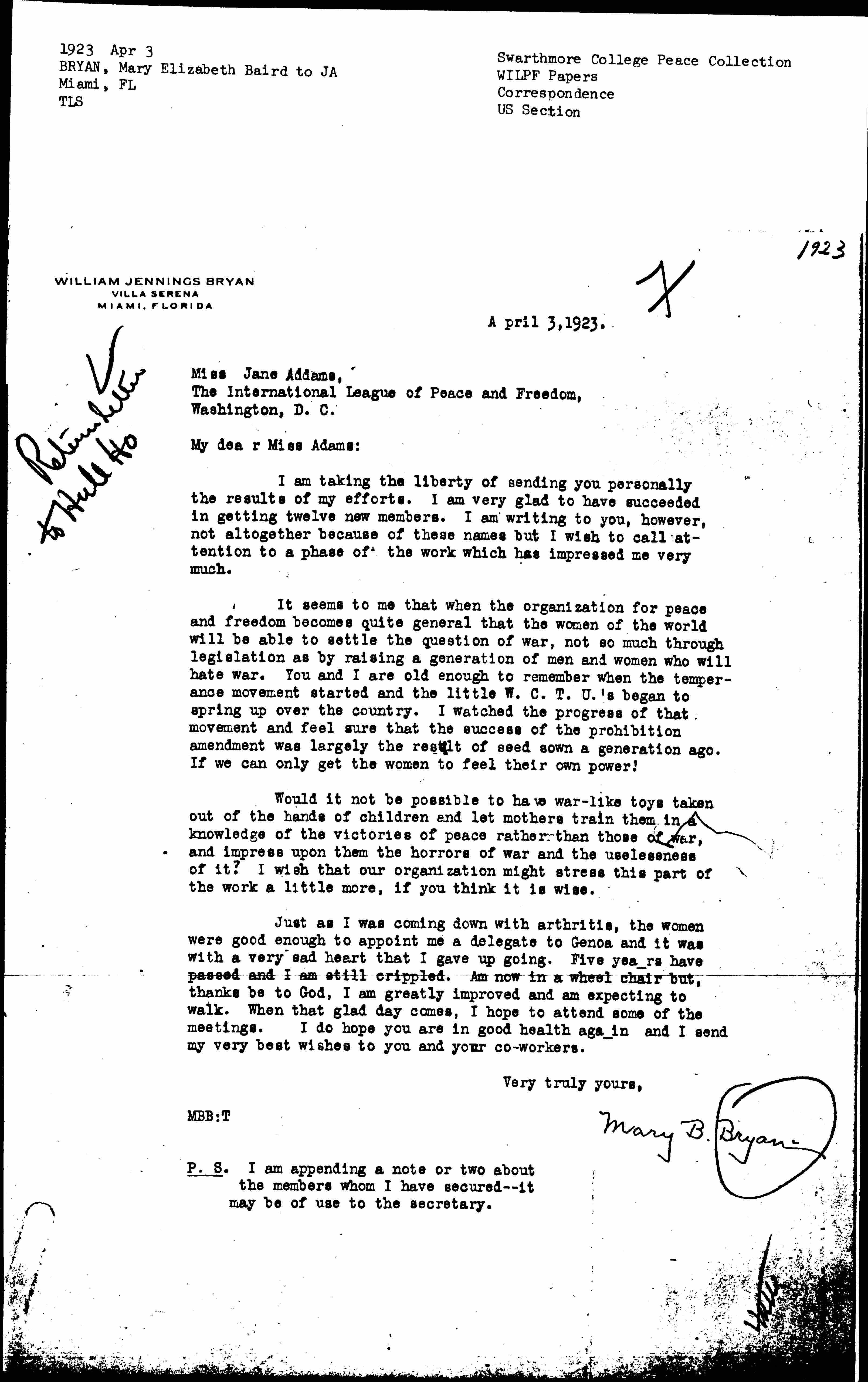 Just as I was coming down with arthritis, the women were good enough to appoint me a delegate to Genoa and it was with a very sad heart that I gave up going. Five years have passed and I am still crippled. Am now in a wheelchair but, thanks be to God, I am greatly improved and am expecting to walk. When that glad day comes, I hope to attend some of the meetings. I do hope you are in good health again and I send my very best wishes to you and your [coworkers].