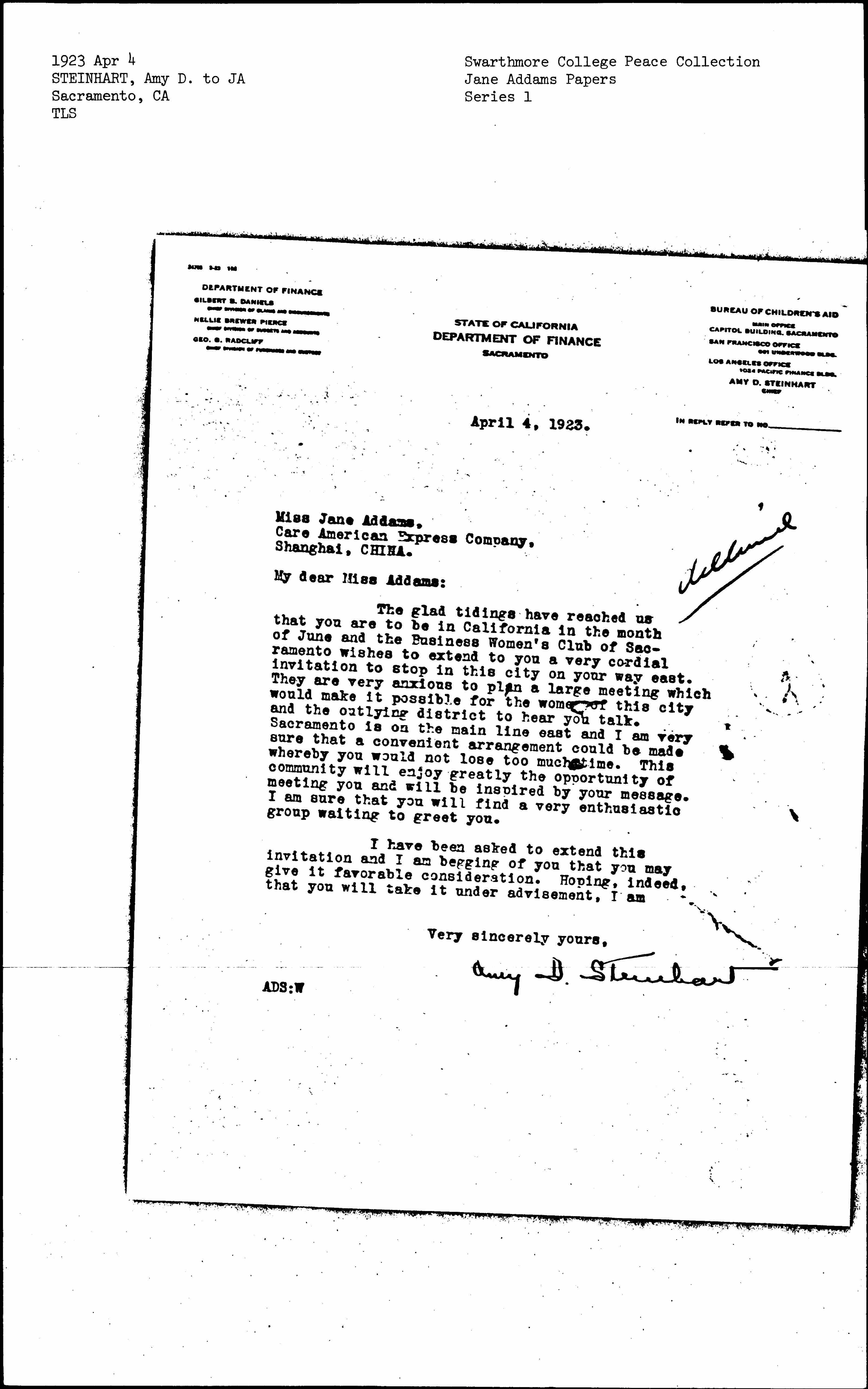 The glad tidings have reached us that you are to be in California in the month of June and Business Women's Club of Sacramento wishes to extend to you a very cordial invitation to stop in this city on your way east. They are very anxious to plan a large meeting which would make it possible for the women of this city and the outlying district to hear you talk. Sacramento is on the main line east and I am very sure that a convenient arrangement could be made whereby you would not lose too much time. This community will enjoy greatly the opportunity of meeting you and will be inspired by your message. I am sure that you will find a very enthusiastic group waiting to greet you.