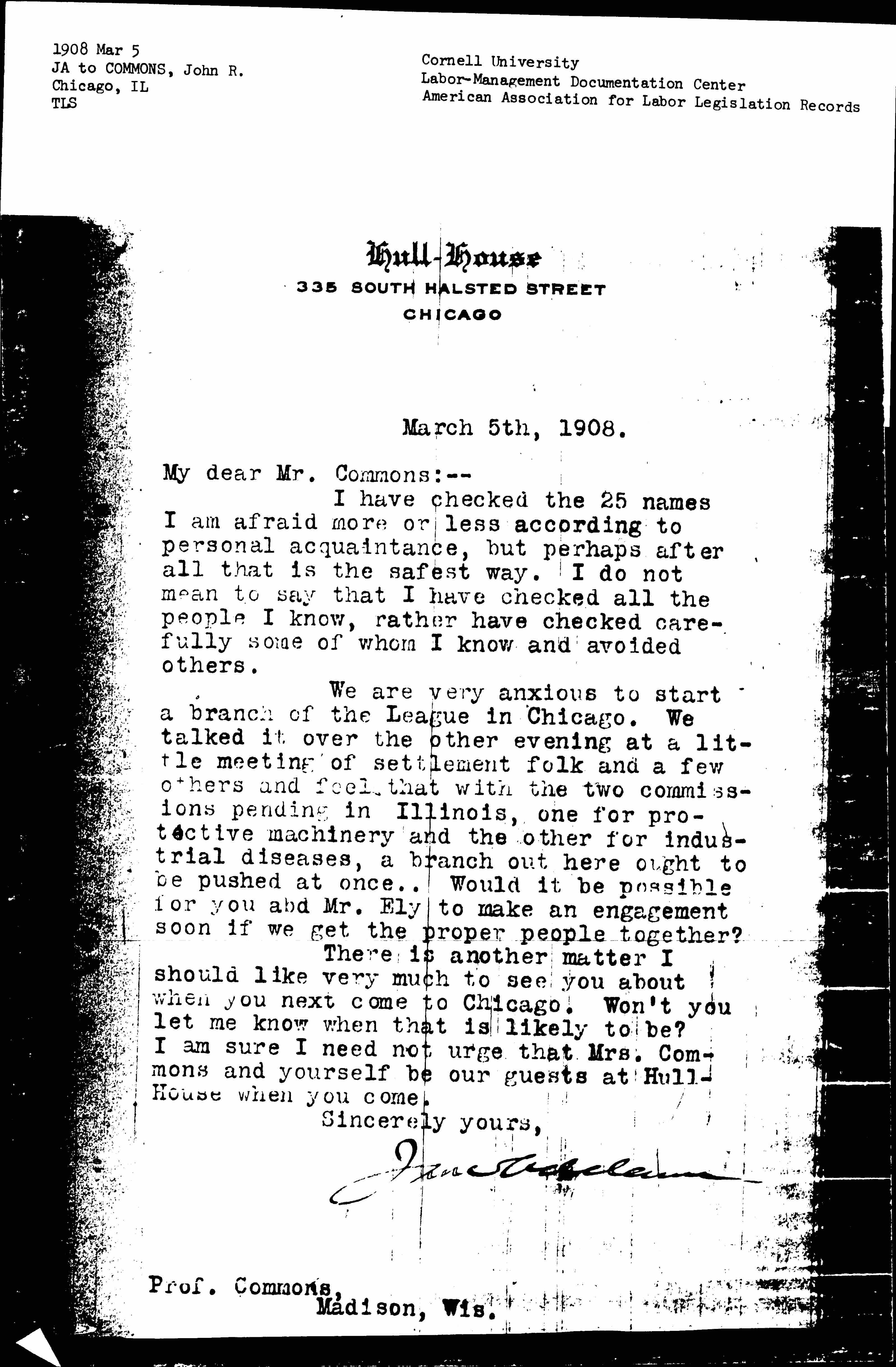 There is another matter I should like very much to see you about when you next come to Chicago. Won't you let me know when that is likely to be? I am sure I need not urge that Mrs. Commons and yourself be our guests at Hull-House when you come.