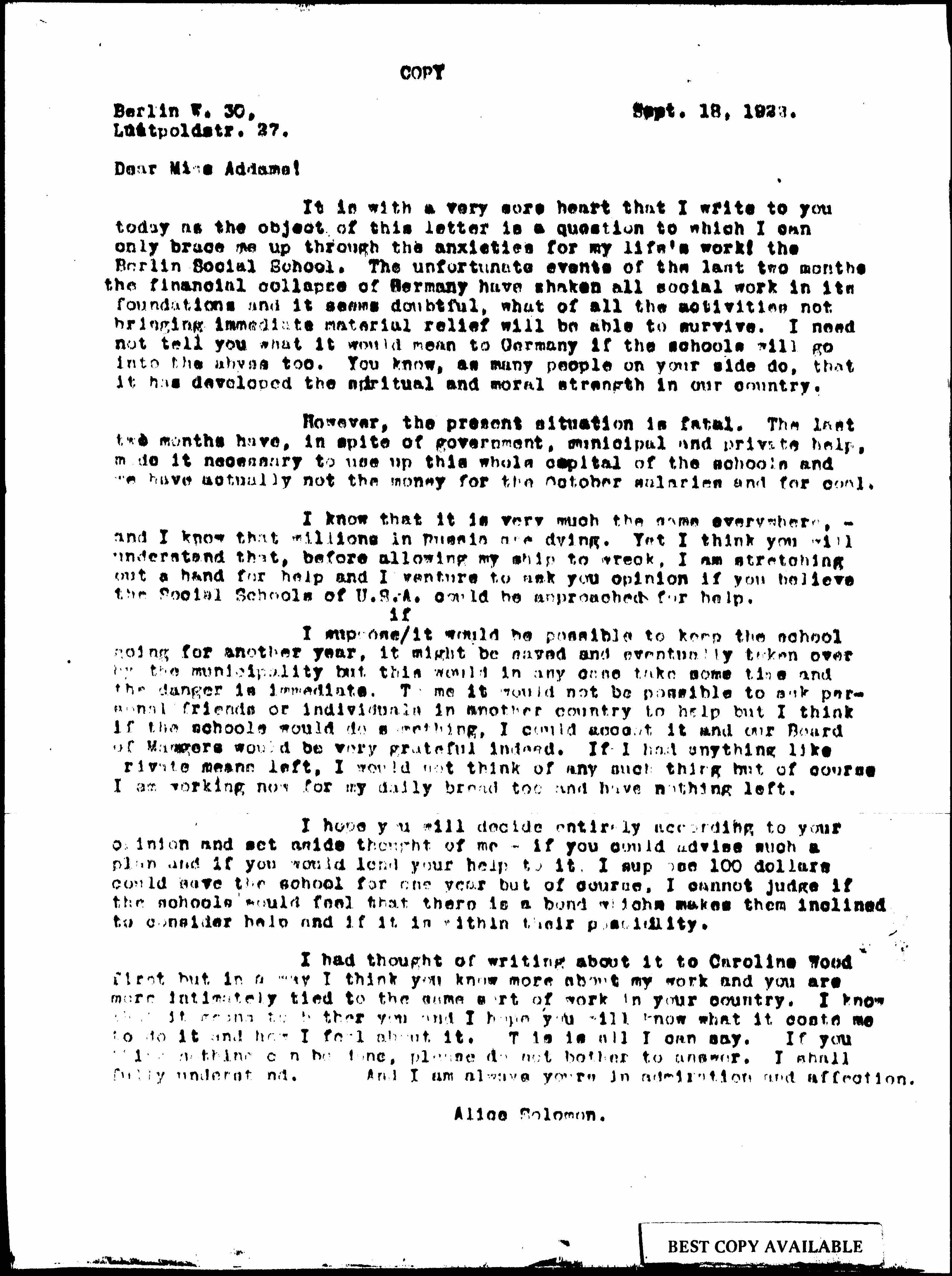 It is with a very sore heart that I write to you today as the object of this letter is a question to which I can only brace [me?] up through the anxieties for my life's work: the Berlin Social School. The unfortunate events of the last two months the financial collapse of Germany have shaken all social work in its foundations and it seems doubtful, what of all the activities not bringing immediate material relief will be able to survive. I need not tell you what it would mean to Germany if the schools will go into the abyss too. You know, as many people on your side do, that it has developed the spiritual and moral strength in our country.