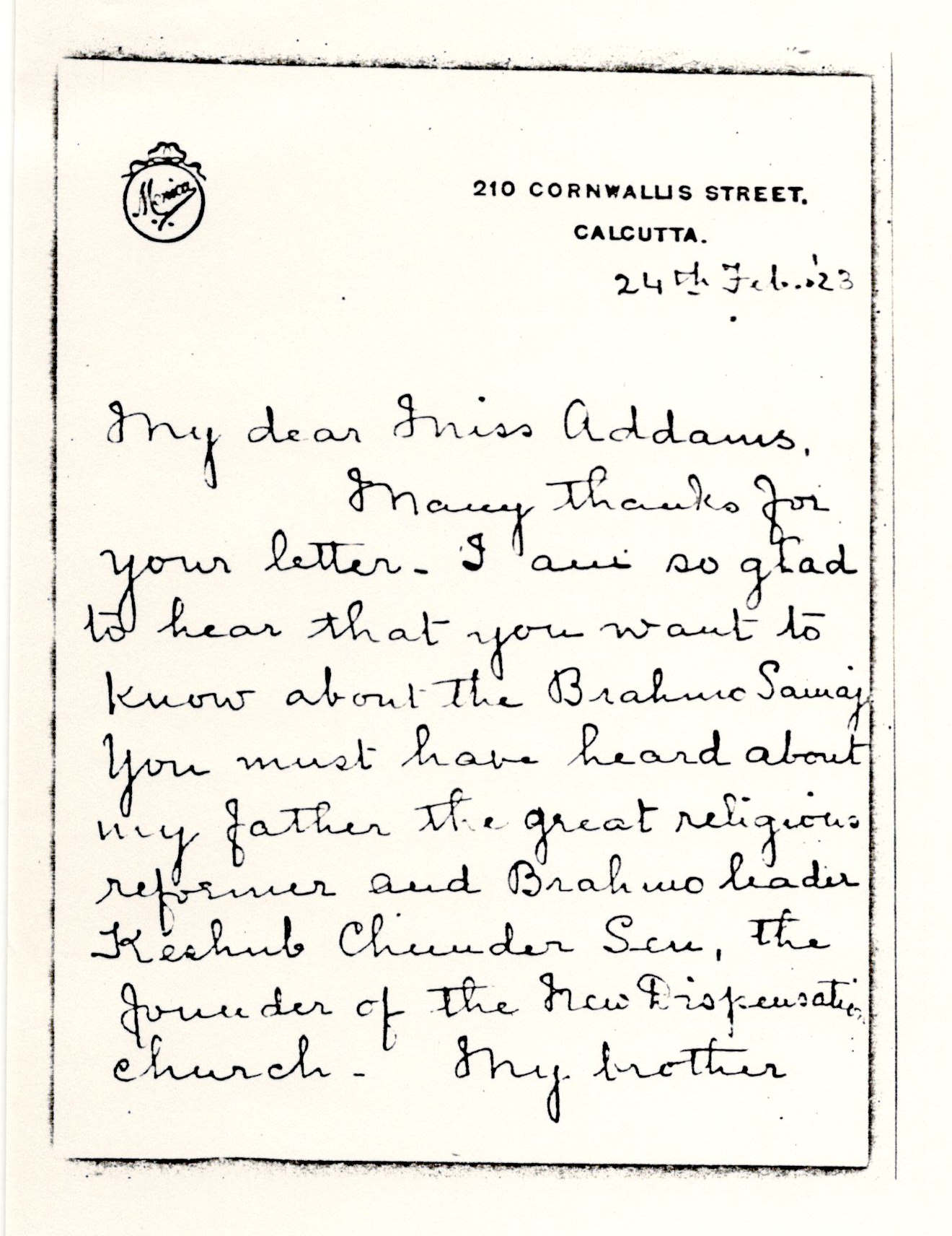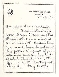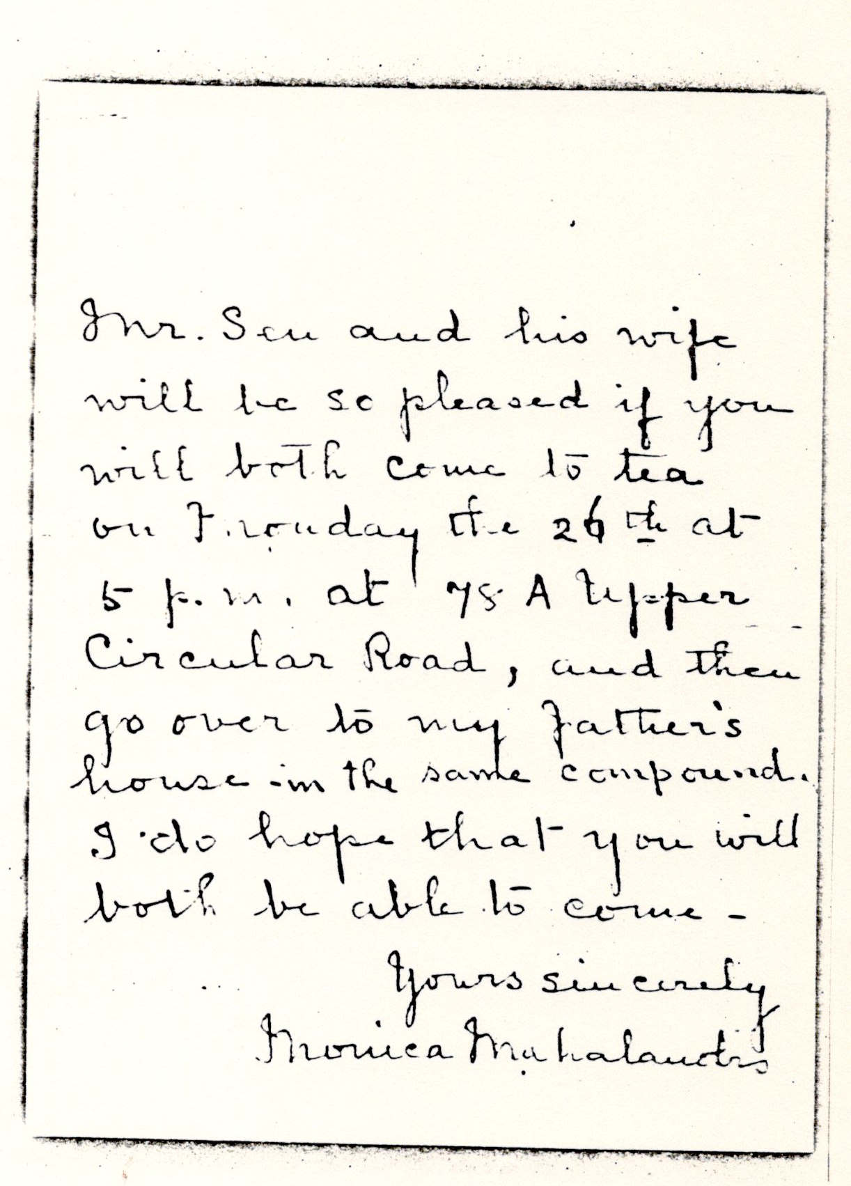 Many thanks for your letter. I am so glad to hear that you want to know about the Brahmo Samaj. You must have heard about my father the great religious reformer and Brahmo leader Keshub Chunder Sen, the founder of the New Dispensation Church. My brother [page 2] Mr. Sen and his wife will be so pleased if you will both come to tea on Monday the 26th at 5 p.m. at 78 A Upper Circular Road, and then go over to my father's house -- in the same compound. I do hope that you will both be able to come.