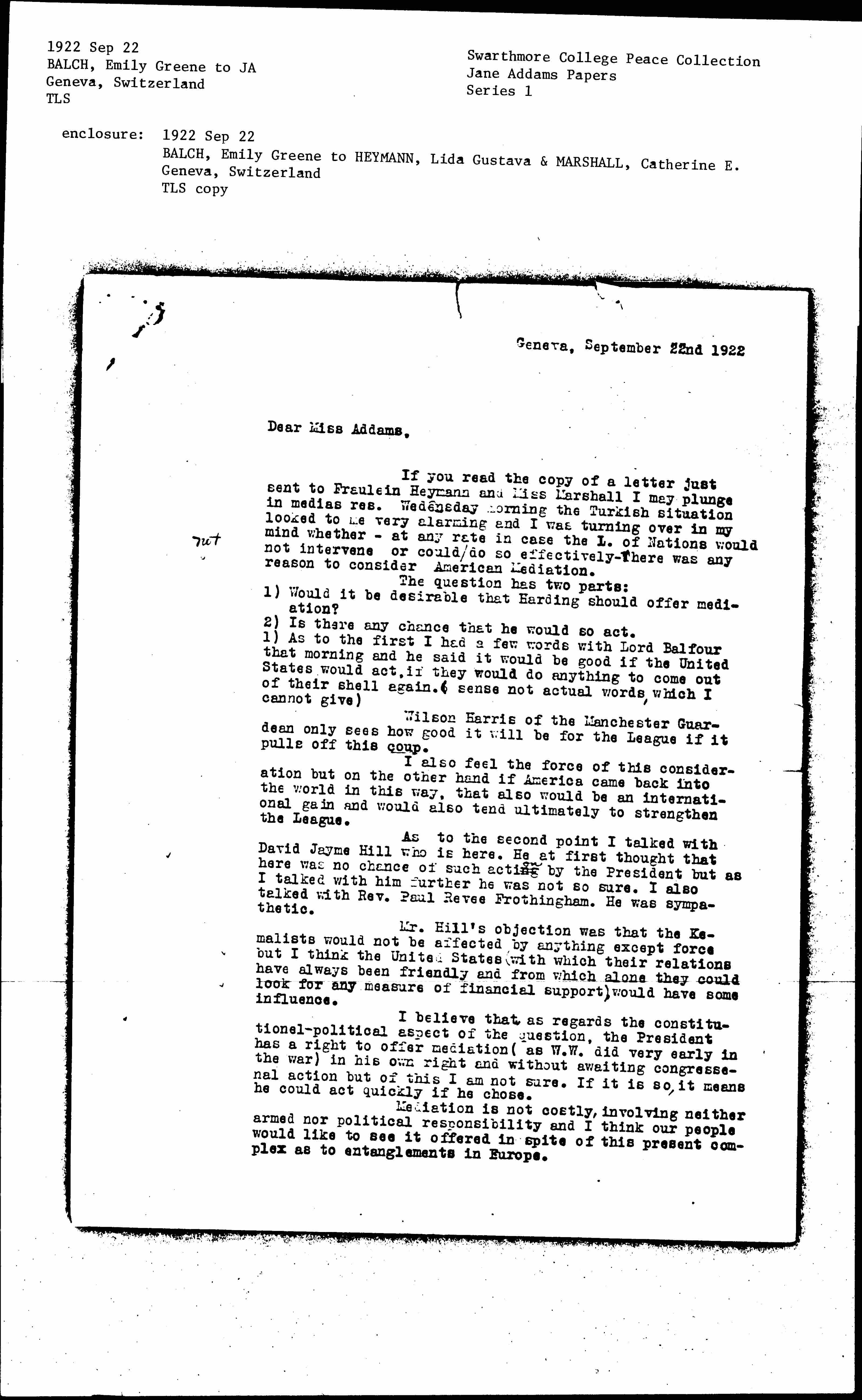 If you read the copy of a letter just sent to Fraulein Heymann and Miss Marshall I may plunge in medias res. Wednesday morning the Turkish situation looked to me very alarming and I was turning over in my mind whether -- at any rate in case the L. of Nations would not intervene or could/do so effectively -- there was any reason to consider American Mediation.