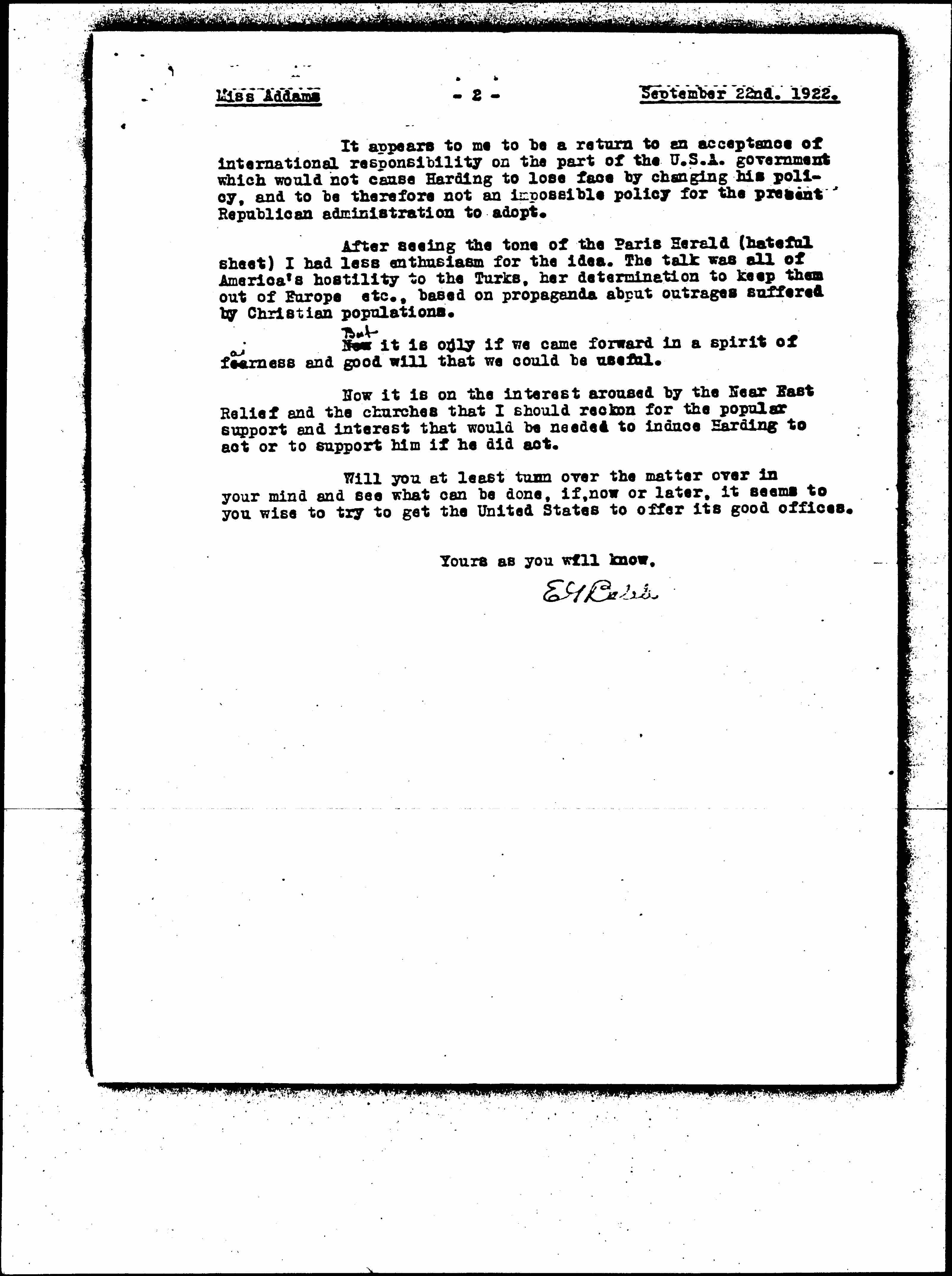 It appears to me to be a return to an acceptance of international responsibility on the part of the U.S.A. government which would not cause Harding to lose face by changing his policy, and to be therefore not an impossible policy for the present Republican administration to adopt. After seeing the tone of the Paris Herald (hateful sheet) I had less enthusiasm for the idea. The talk was all of America’s hostility to the Turks, her determination to keep them out of Europe etc., based on propaganda about outrages suffered by Christian populations.