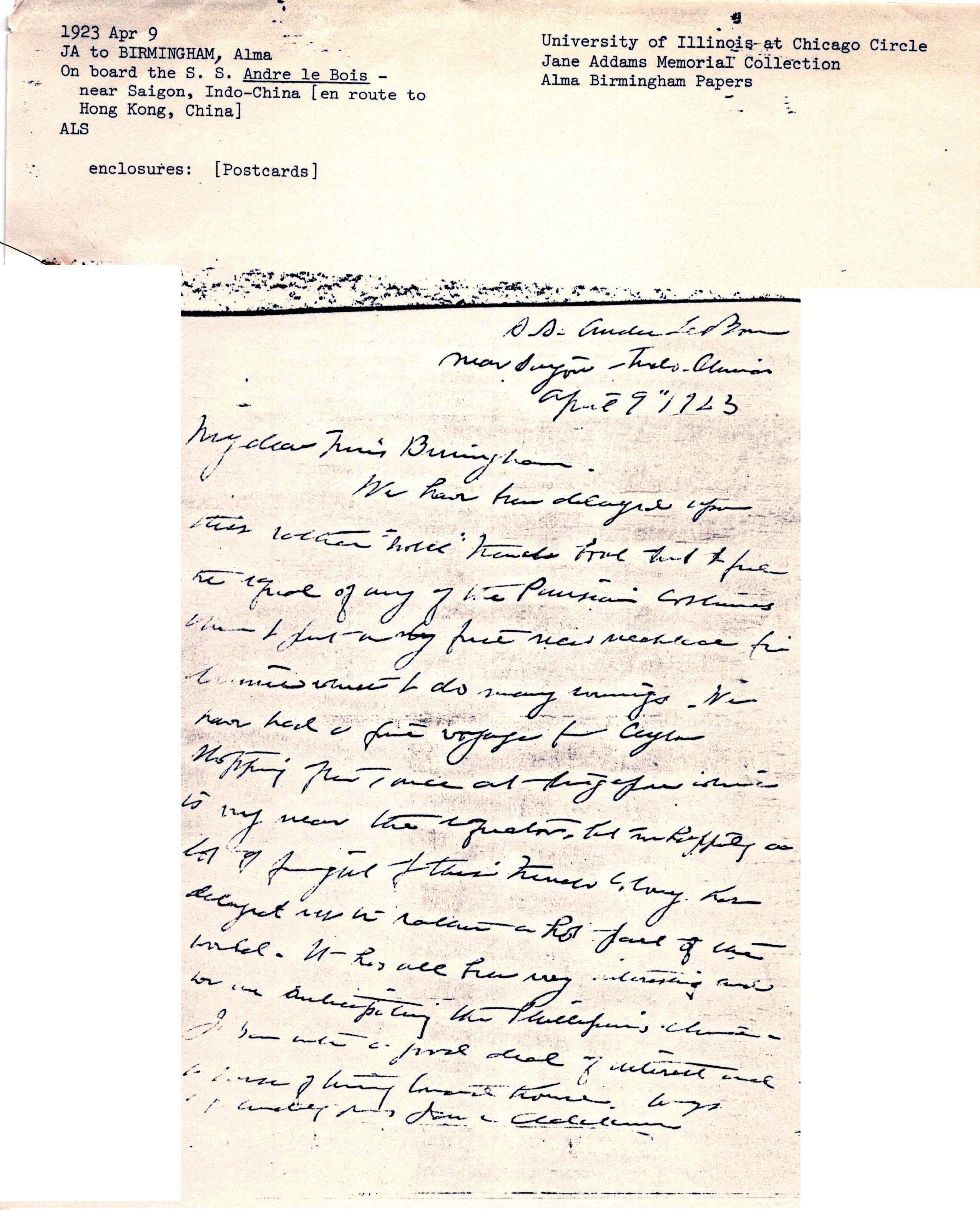 We have been delayed upon this rather "hotel" French boat that I feel the equal of any of the Parisian costumes when I put on my fine new necklace for dinner which I do many evenings. We have had a fine voyage from Ceylon stopping often, once at Singapore which is very near the equator, but unhappily a lot of [illegible] of this French colony has delayed us in rather a hot part of the world. It has all been very interesting and we are anticipating the [Philippines'] climate. [Illegible] with a good deal of interest and [a sense] of turning toward home. Always [and cordially?] yours Jane Addams