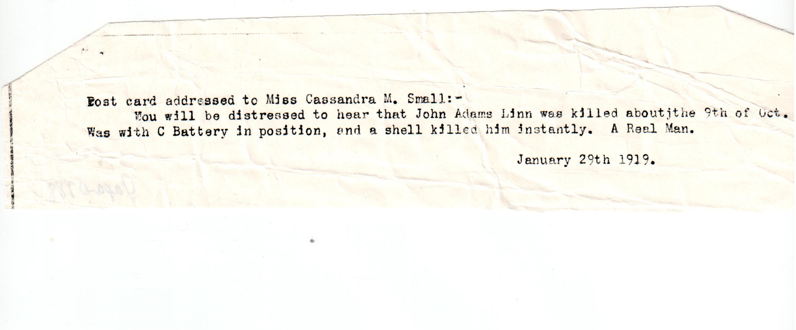 You will be distressed to hear that John [Addams] Linn was killed about the 9th of Oct. Was with C Battery in position, and a shell killed him instantly. A Real Man.