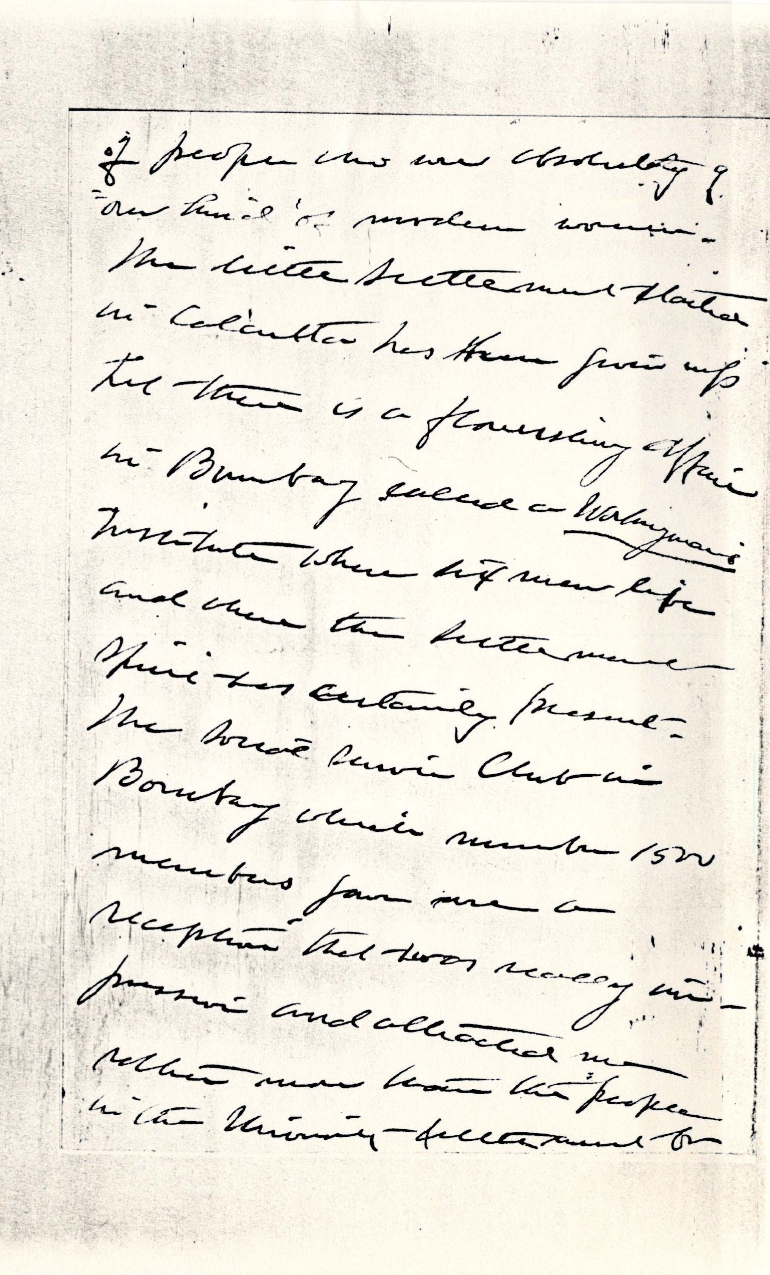 The little settlement started in Calcutta has been given up but there is a flourishing office in Bombay called a Workingman's Institute where six men live and where the settlement spirit was certainly present. The Social Service Club in Bombay which number 1500 members gave me a reception that was really impressive and attracted me rather more than the people in the University Settlement for [page 5] women [although] they were also nice. I have sent some material to Mr Catchpool at Toynbee Hall asking him to communicate with Capt Ellis.