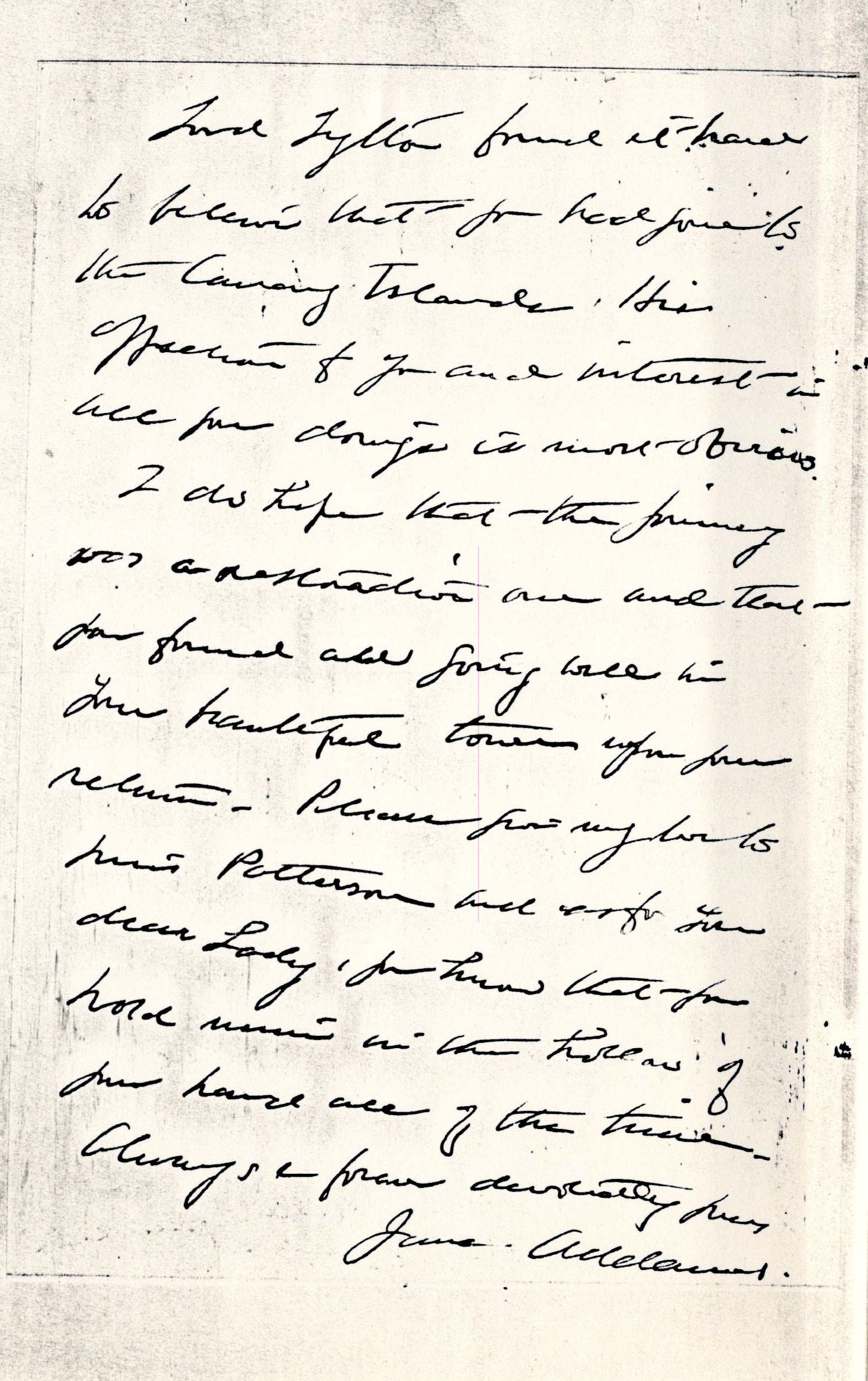 I do hope that the journey was a restorative one and that you found all going well in your beautiful town upon your return. Please give my love to Miss Patterson and as for you dear Lady, you know that you hold mine in the hollow of your hand all of the time.