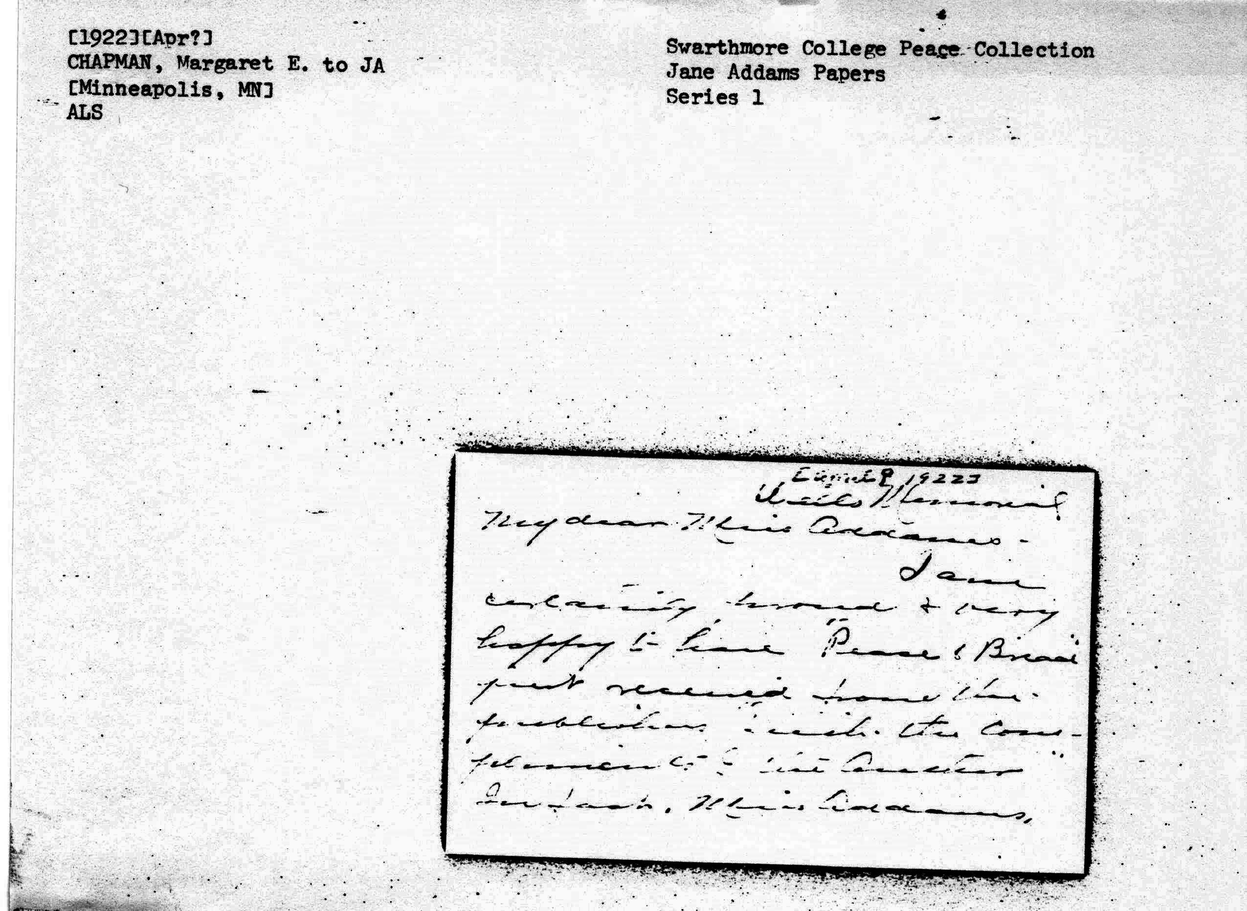 I am certainly proud & very happy to have "Peace & Bread" just received from the publisher "with the compliments of the Author." In fact, Miss Addams, [page 2] I feel very highly honored. I know I shall enjoy reading it & it will bring to me the importance that all your [working is].