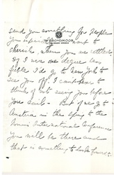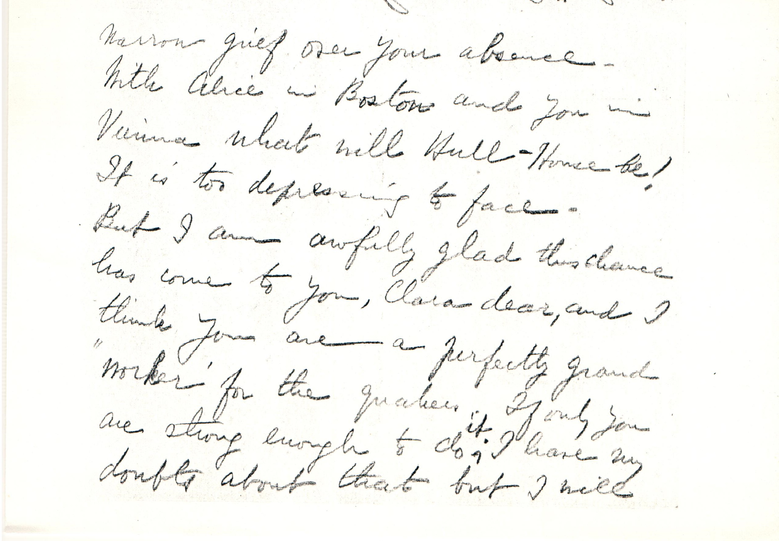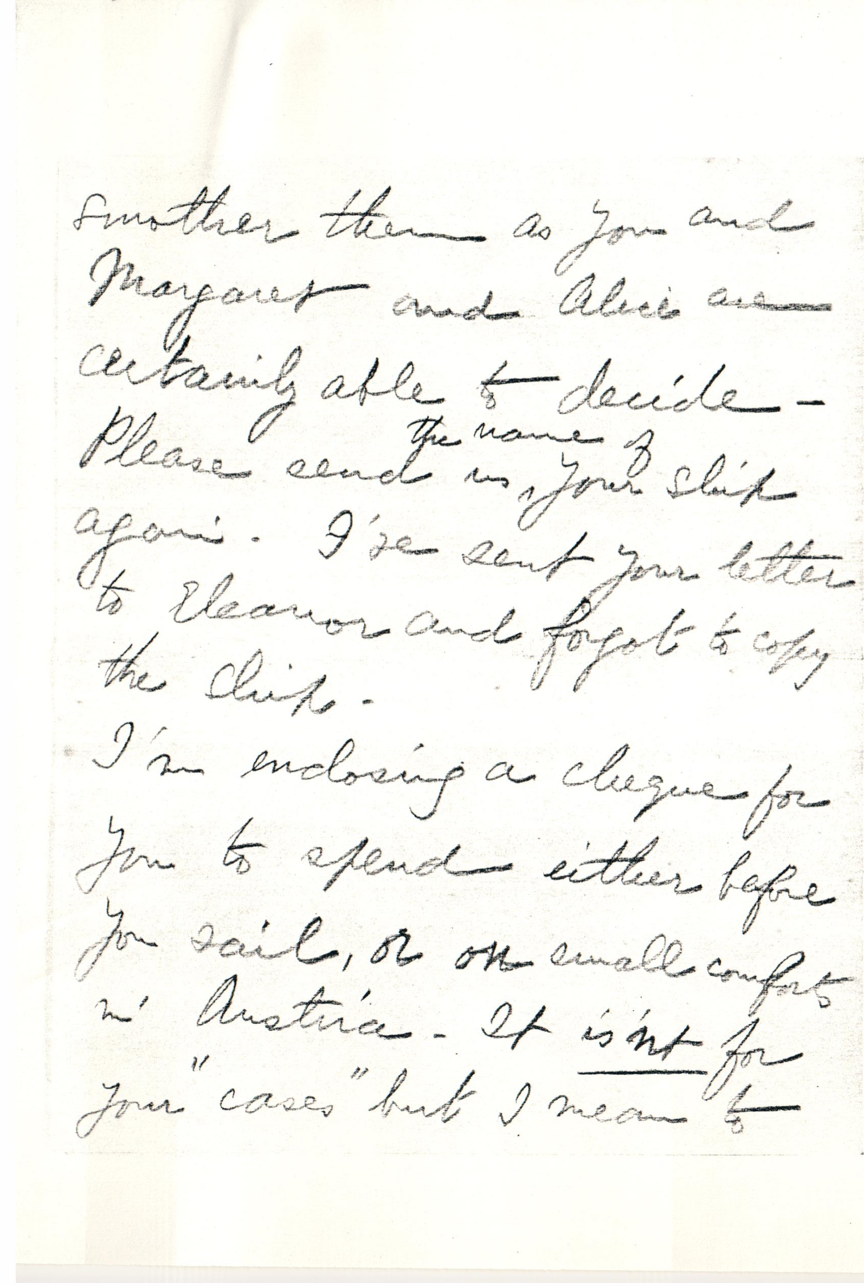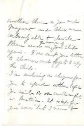 But I am awfully glad this chance has come to you, Clara dear, and I think you are a perfectly grand "worker" for the Quakers. If only you are strong enough to do ↑it↓. I have my doubts about that but I will [page 4] smother them as you and Margaret and Alice are certainly able to decide. Please send us ↑the name of↓ your ship again. I've sent your letter to Eleanor and forgot to copy the ship.
