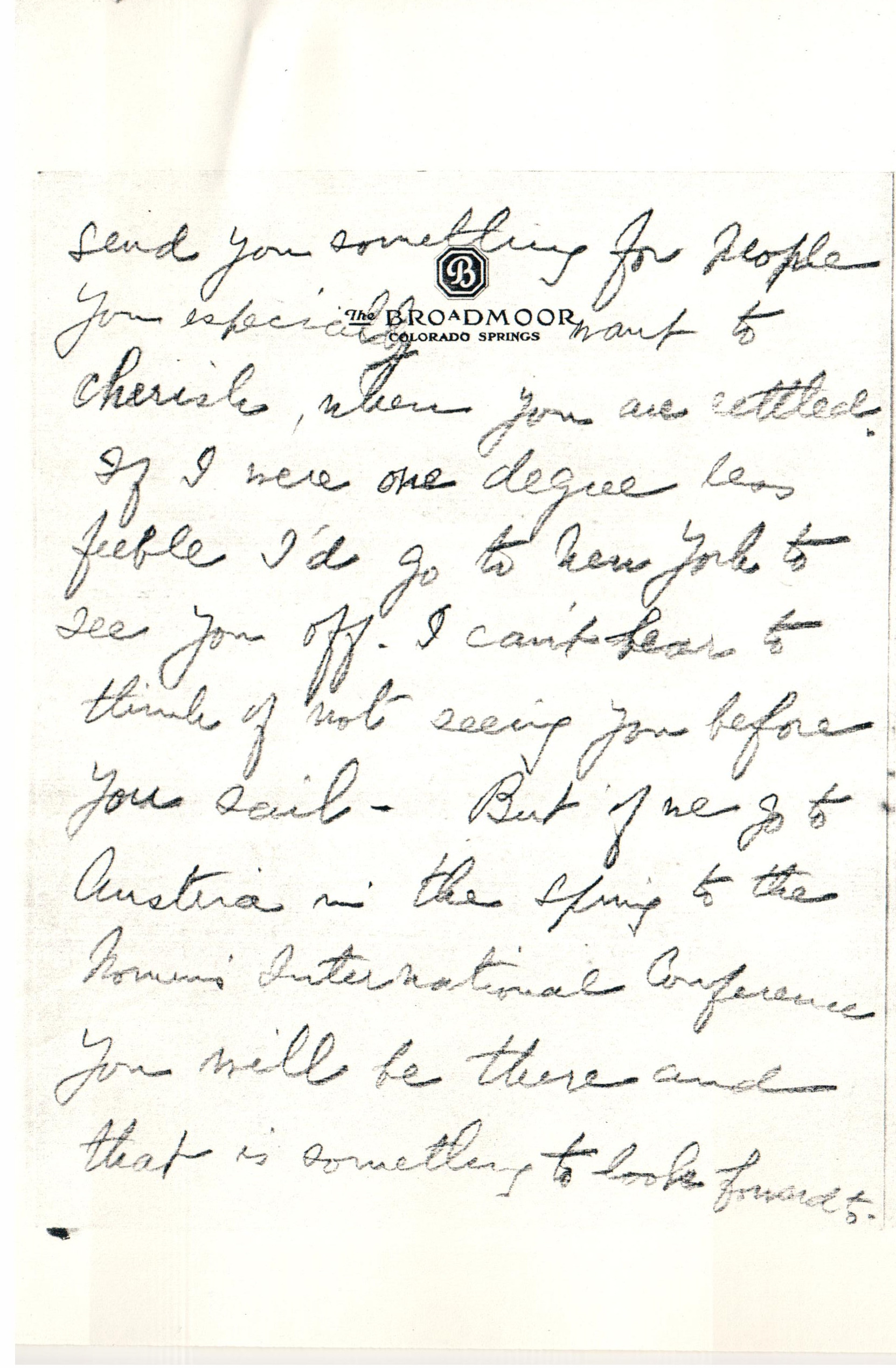 I'm enclosing a [check] for you to spend either before you sail, or on small comforts in Austria. It isn't for your "cases" but I mean to [page 5] send you something for people you especially want to cherish, when you are settled. If I were one degree less feeble I'd go to New York to see you off. I can't bear to think of not seeing you before you sail. But if we go to Austria in the spring to the Women's International Conference you will be there and that is something to look forward to. [page 6]
