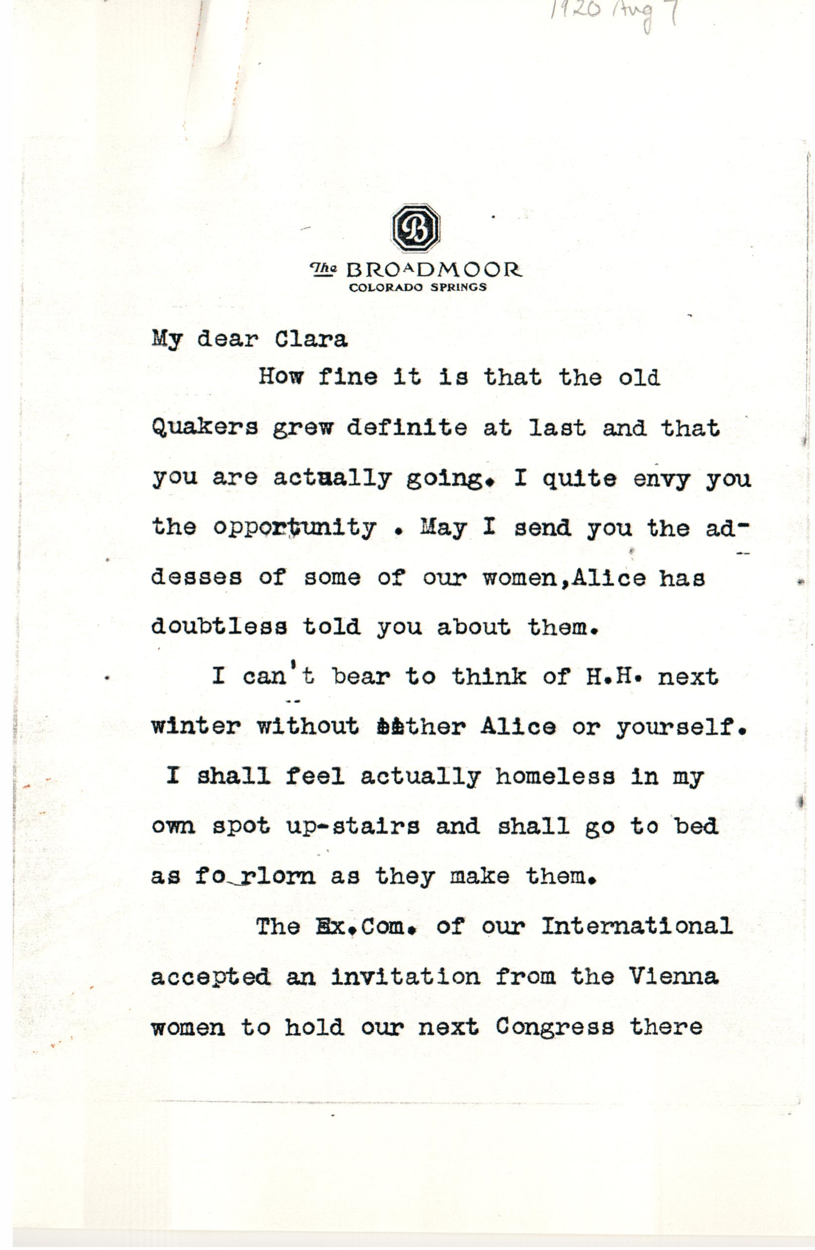 The Ex. Com. of our International accepted an invitation from the Vienna women to hold our next Congress there [page 2] provided no new difficulties intervened, so perhaps I shall you next in Vienna.