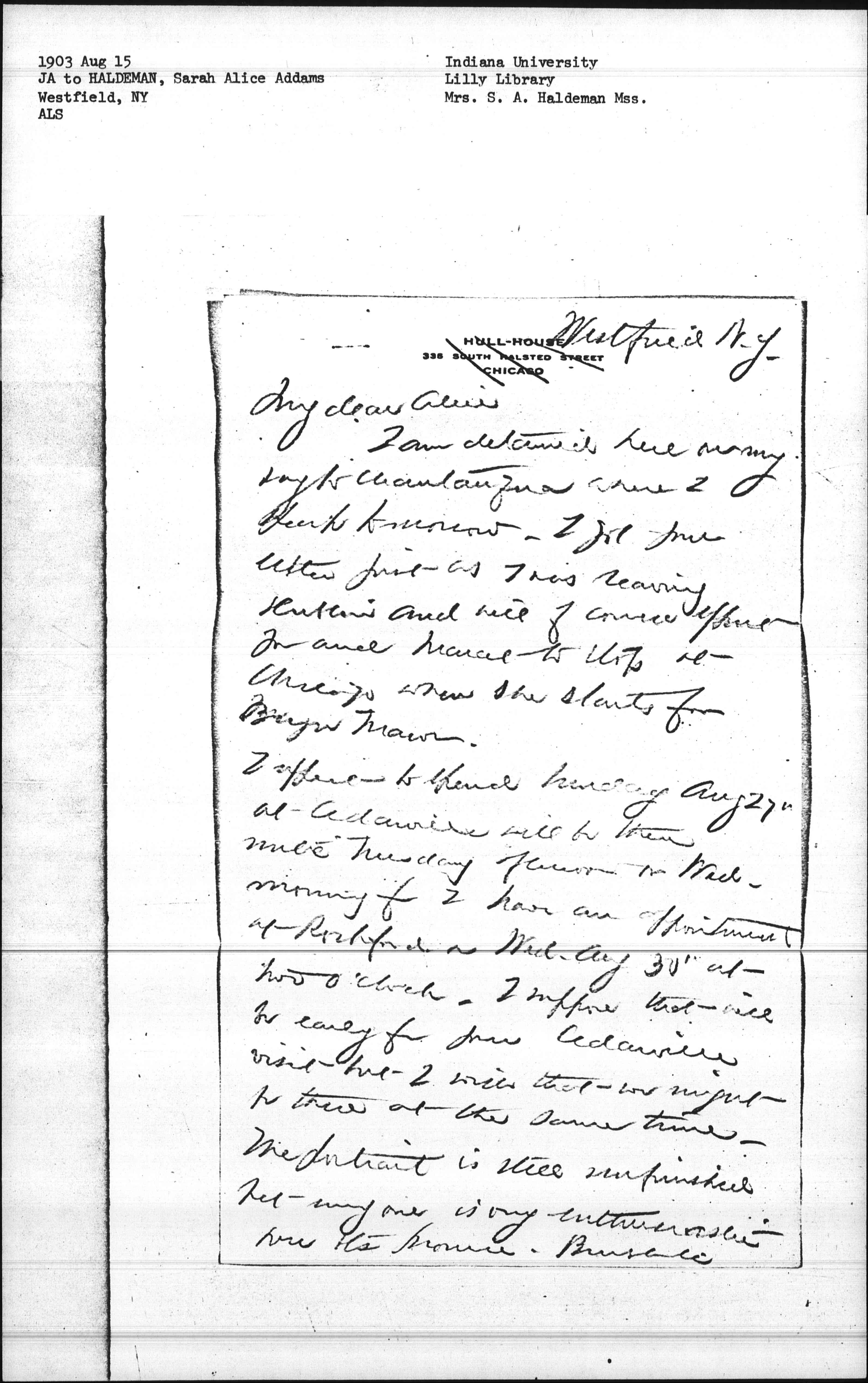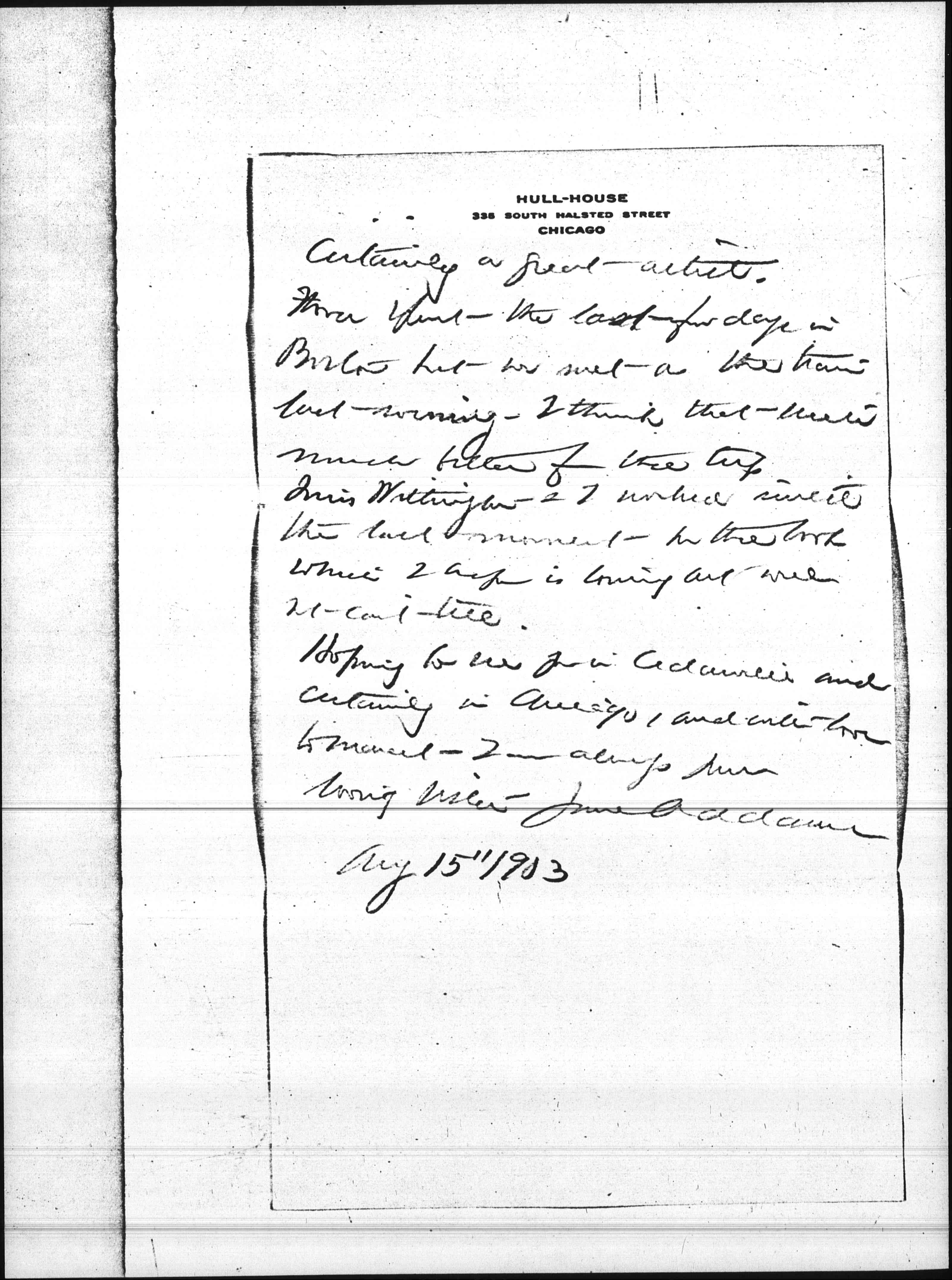 Hoping to see you in Cedarville and certainly in Chicago, and with love to Marcet I am always your loving sister Jane Addams