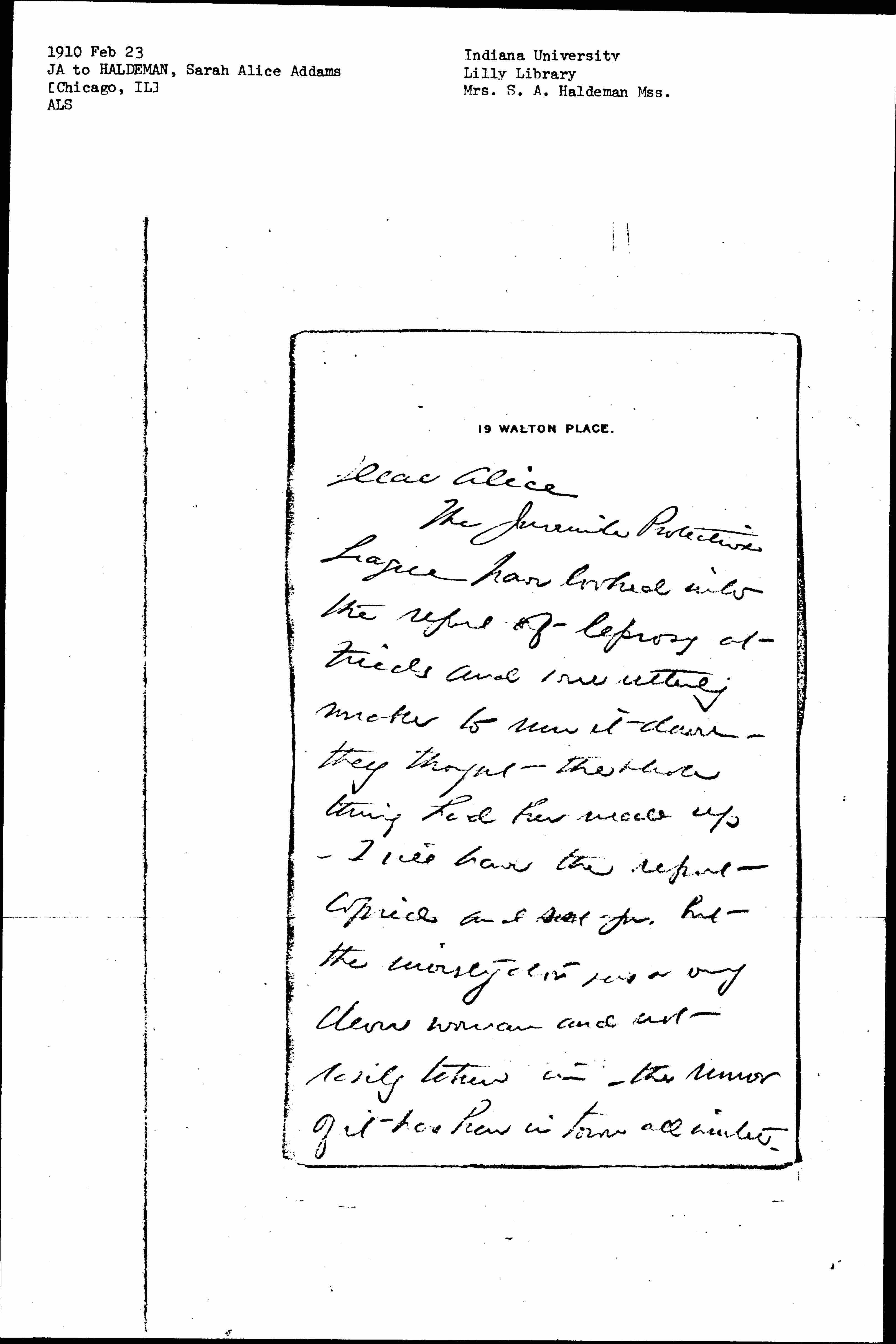 The Juvenile Protective League have looked into the report of leprosy at [Fields] and were utterly unable to run it down -- they thought the whole thing had been made up -- I will have the report copied and sent you, but the investigator was a very clever woman and not easily taken in -- the rumor of it has been in town all winter. [page 2] I am returning Mrs Dodge's letter with regret that I can suggest no one. [Carnegie] is unique and ↑for↓ there are few rich people willing to send money to small places with which they have no personal connection. I am so glad that you are going to change your household arrangements -- [although] the new family sounds rather large for the space. I am back and forth at Hull-House but have not yet settled down there. [page 3] I hope to go to Cedarville very soon. When are you coming in? Mary Smith joins me in sending her best love.