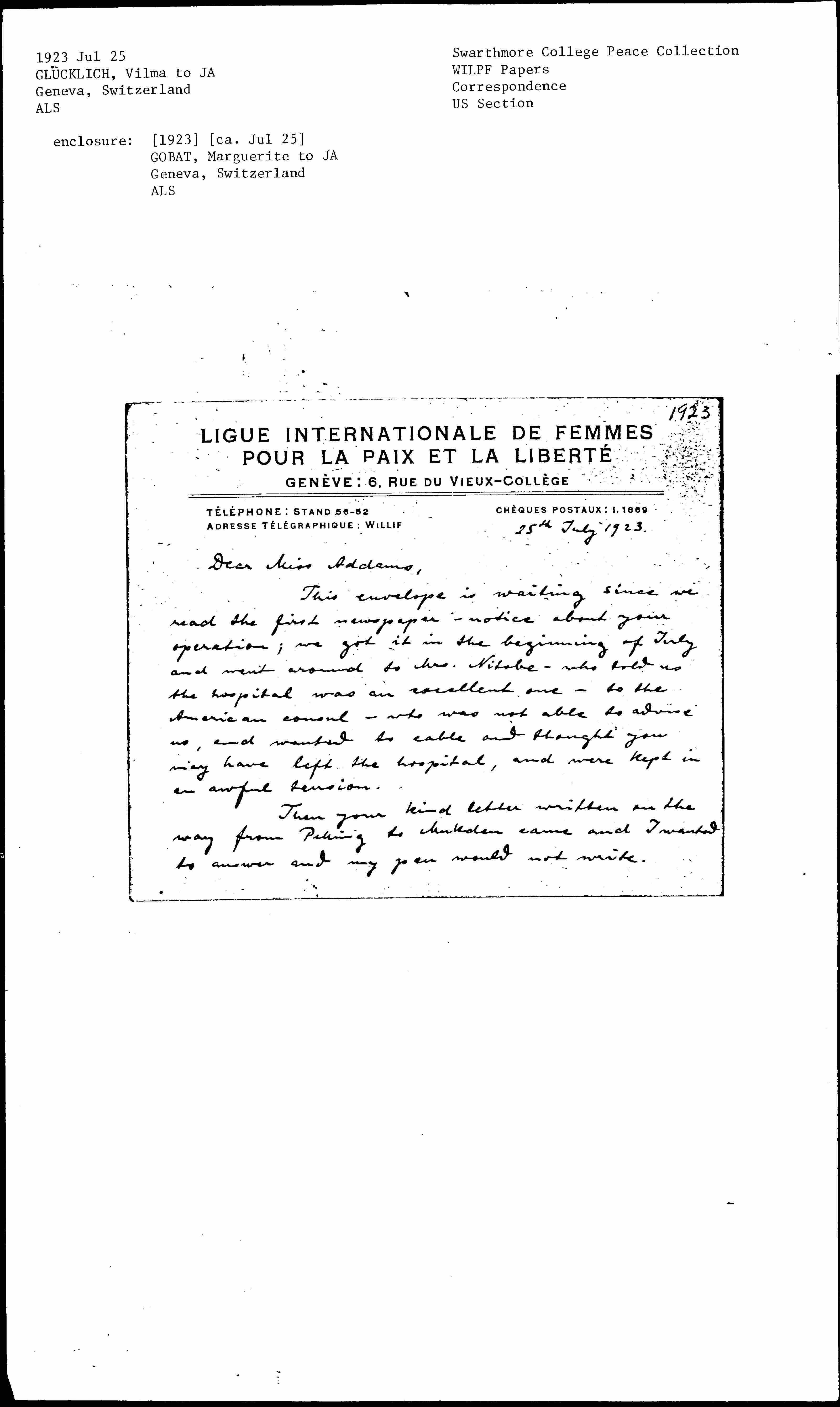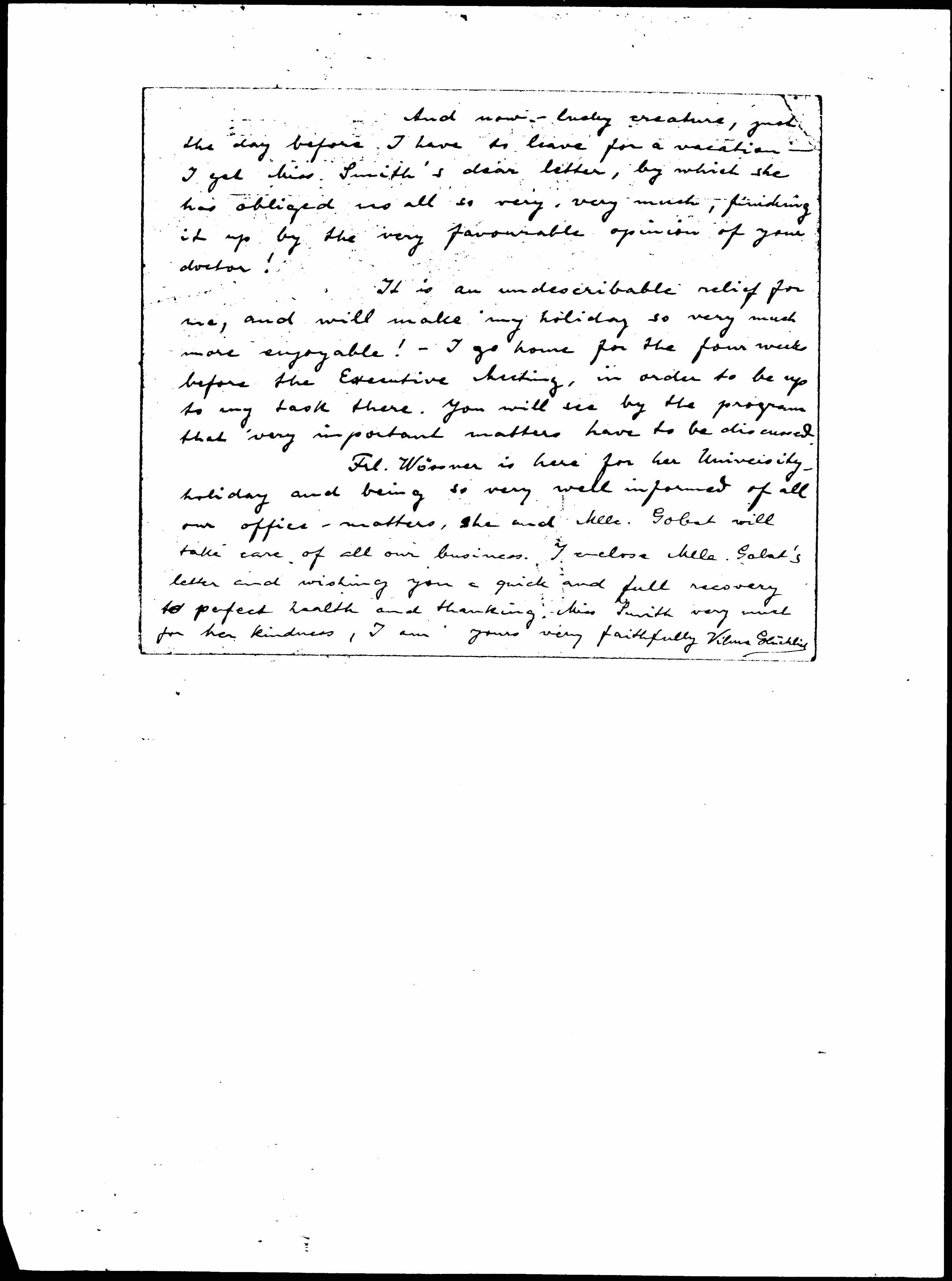 Frl. Wössner is here for her University holiday and being so very well informed of all our office-matters, she and Mlle. Gobat will take care of all our business. I enclose Mlle. Gobat's letter and wishing you a quick and full recovery to perfect health and thanking Miss Smith very much for her kindness, I am yours very faithfully Vilma Glücklich