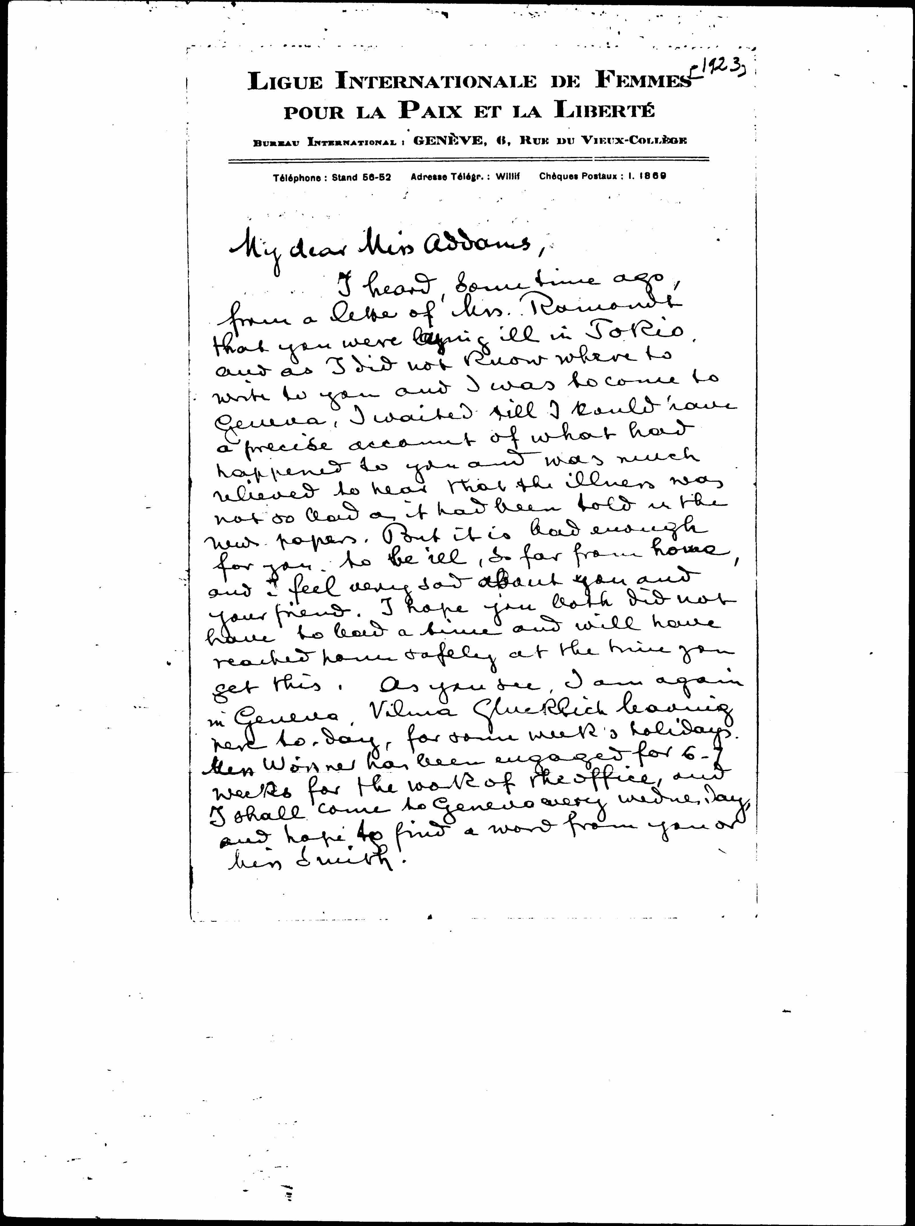 I heard, some time ago, from a [letter] of Mrs. Ramondt that you were laying ill in [Tokyo], and as I did not know where to write to you and I was to come to Geneva, I waited till I could have a precise account of what had happened to you and was much relieved to hear that the illness was not so bad as it had been told in the [newspapers]. But it is bad enough for you, to be ill, so far from home, and I feel very sad about you and your friend. I hope you both did not have [too] bad a time and will have reached home safely at the time you get this. As you see, I am again in Geneva. Vilma Glücklich leaving here [today], for some week's holidays. Miss Wössner has been engaged for 6-7 weeks for the work of the office, and I shall come to Geneva every Wednesday, and hope to find a word from you or Miss Smith. [page 2]