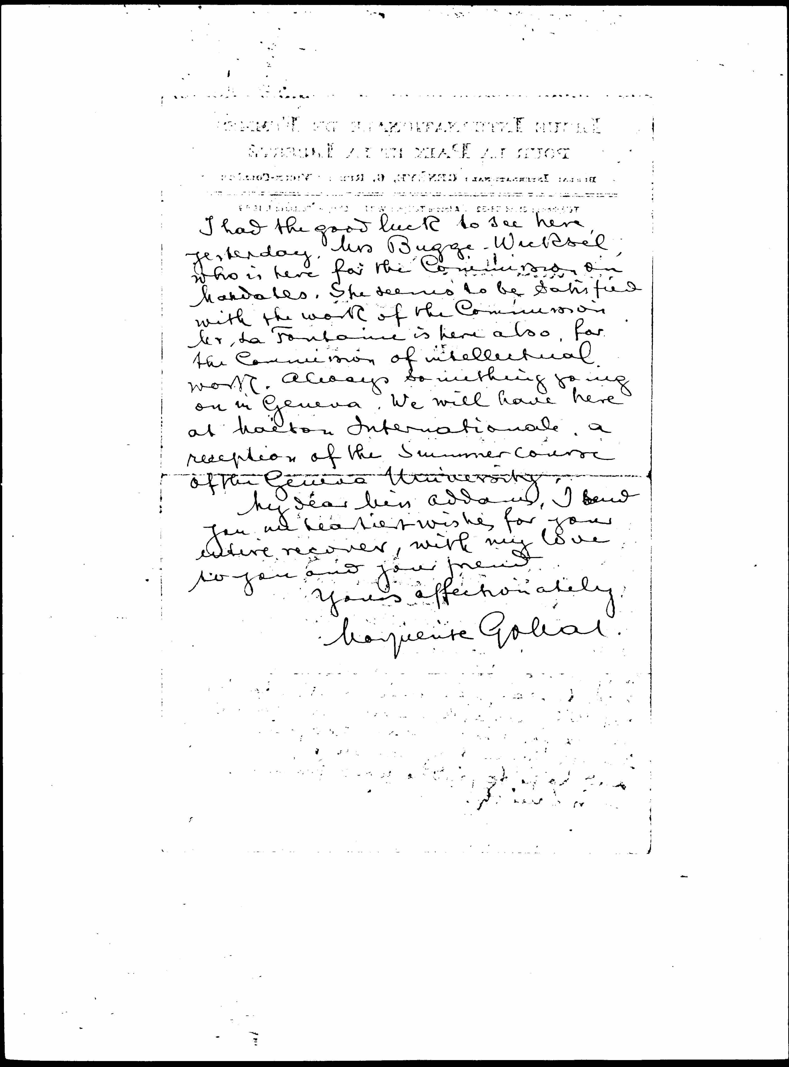 I had the good luck to see here yesterday Mrs Bugge-[Wicksell], who is here for the Commission on Mandates. She seems to be satisfied with the work of the Commission. Mr La Fontaine is here also, for the Commission of intellectual work. Always something going on in Geneva. We will have here at Maison Internationale a reception of the summer course of the Geneva University.