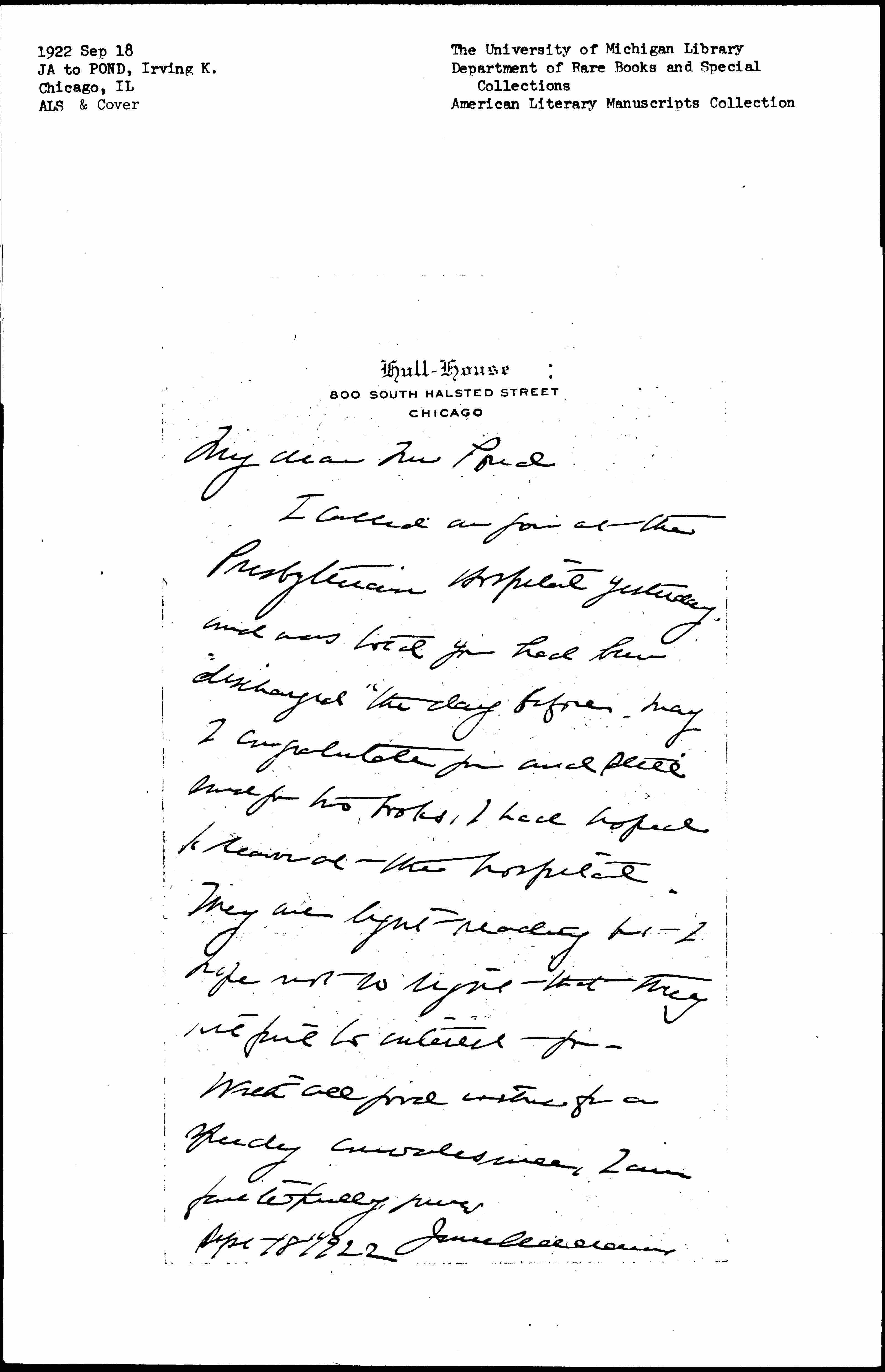 I called on you at the Presbyterian Hospital yesterday, and was told you had been "discharged" the day before. May I congratulate you and still send you two books, I had hoped to leave at the hospital. They are light reading but I hope not so light that they will fail to interest you.