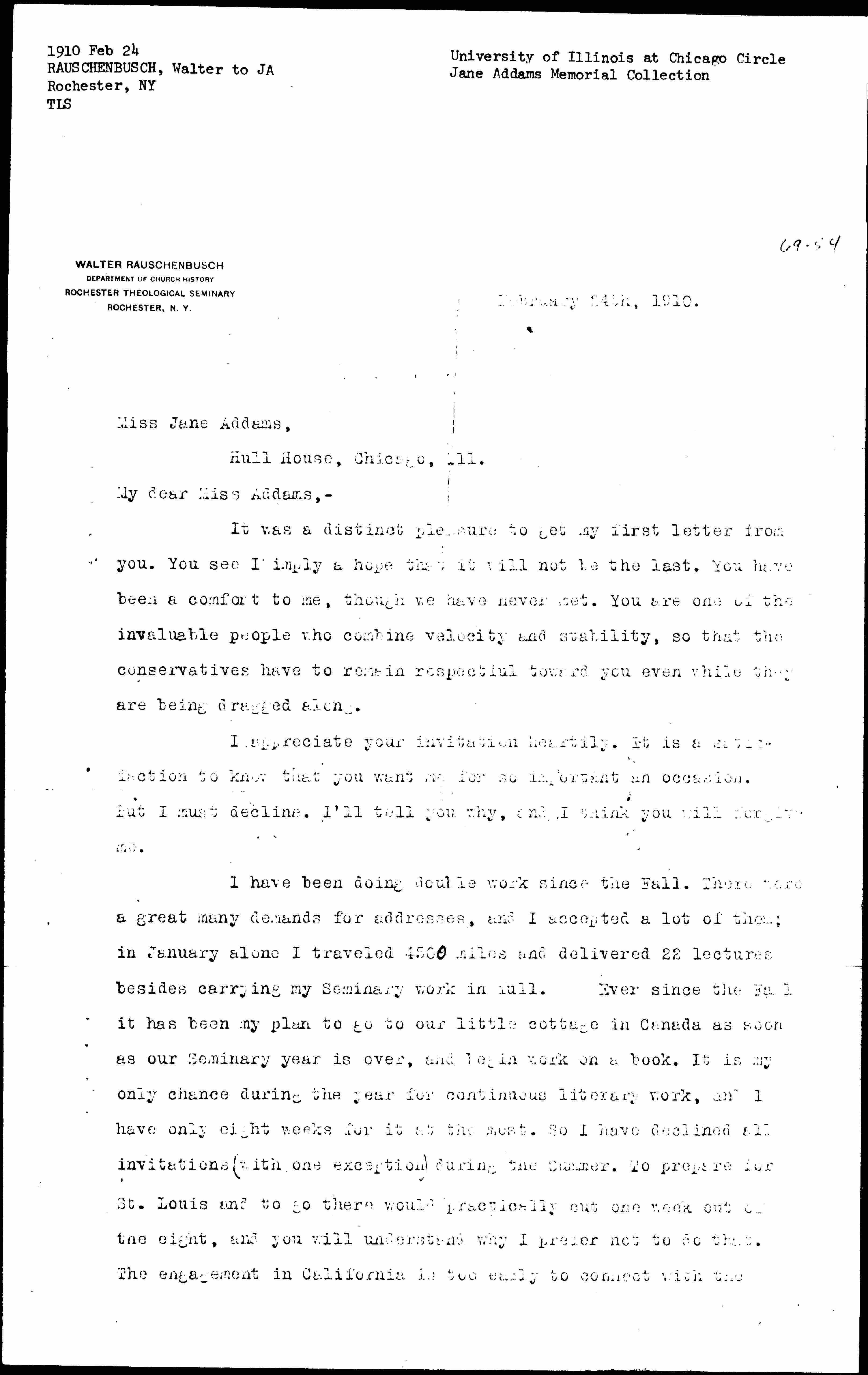 I have been doing double work since the Fall. There were a great many demands for addresses, and I accepted a lot of them; in January alone I traveled 4500 miles and delivered 22 lectures besides carrying my Seminary work in full. Ever since the Fall it has been my plan to go to our little cottage in Canada as soon as our Seminary year is over, and begin work on a book. It is my only chance during the year for continuous literary work, and I have only eight weeks for it at the most. So I have declined all invitations (with one exception) during the Summer. To prepare for St. Louis and to go there would practically cut one week out of the eight, and you will understand why I prefer not to do that. The engagement in California is too early to connect with the [page 2] National Conference. I leave for California in the middle of April and return in the beginning of May.