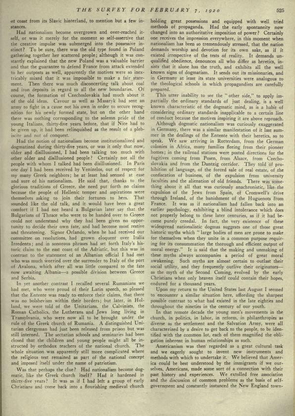 Was that perhaps the clue? Had nationalism become dogmatic, like the Greek church itself? Had it hardened in thirty-five years? It was as if I had left a group of early Christians and come back into a flourishing medieval church holding great possessions and equipped with well tried methods of propaganda. Had the early spontaneity now changed into an authoritative imposition of power? Certainly one receives the impression everywhere, in this moment when nationalism has been so tremendously stressed, that the nation demands worship and devotion for its own sake, as if it existed irrespective of the tests of reality. It demands unqualified obedience, denounces all who differ as heretics, insists that it alone has the truth, and exhibits all the well known signs of dogmatism. It sends out its missionaries, and in Germany at least its state universities were analogous to the theological schools in which propagandists are carefully prepared.