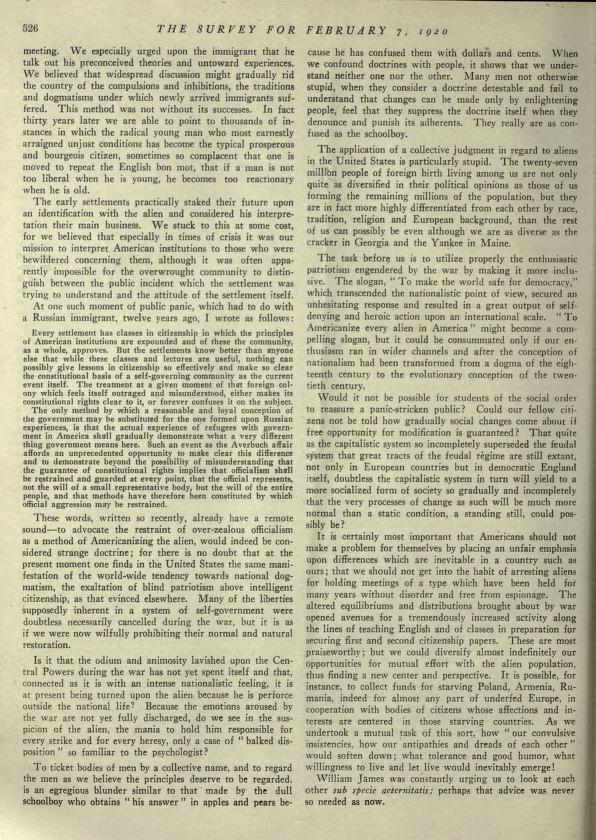 It is certainly most important that Americans should not make a problem for themselves by placing an unfair emphasis upon differences which are inevitable in a country such as ours; that we should not get into the habit of arresting aliens for holding meetings of a type which have been held for many years without disorder and free from espionage. The altered equilibriums and distributions brought about by war opened avenues for a tremendously increased activity along the lines of teaching English and of classes in preparation for securing first and second citizenship papers. These are most praiseworthy; but we could diversify almost indefinitely our opportunities for mutual effort with the alien population, thus finding a new center and perspective. It is possible, for instance, to collect funds for starving Poland, Armenia, [Romania], indeed for almost any part of underfed Europe, in cooperation with bodies of citizens whose affections and interests are centered in those starving countries. As we undertook a mutual task of this sort, how “our convulsive inconsistencies, how our antipathies and dreads of each other” would soften down; what tolerance and good humor, what willingness to live and let live would inevitably emerge!