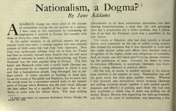 The task before us is to utilize properly the enthusiastic patriotism engendered by the war by making it more inclusive. The slogan “To make the world safe for democracy,” which transcended the nationalistic point of view, secured an unhesitating response and resulted in a great output of self-denying and heroic action upon an international scale. "To Americanize every alien in America" might become a compelling slogan, but it could be consummated only if our enthusiasm ran in wider channels and after the conception of nationalism had been transformed from a dogma of the eighteenth century to the evolutionary conception of the twentieth century.