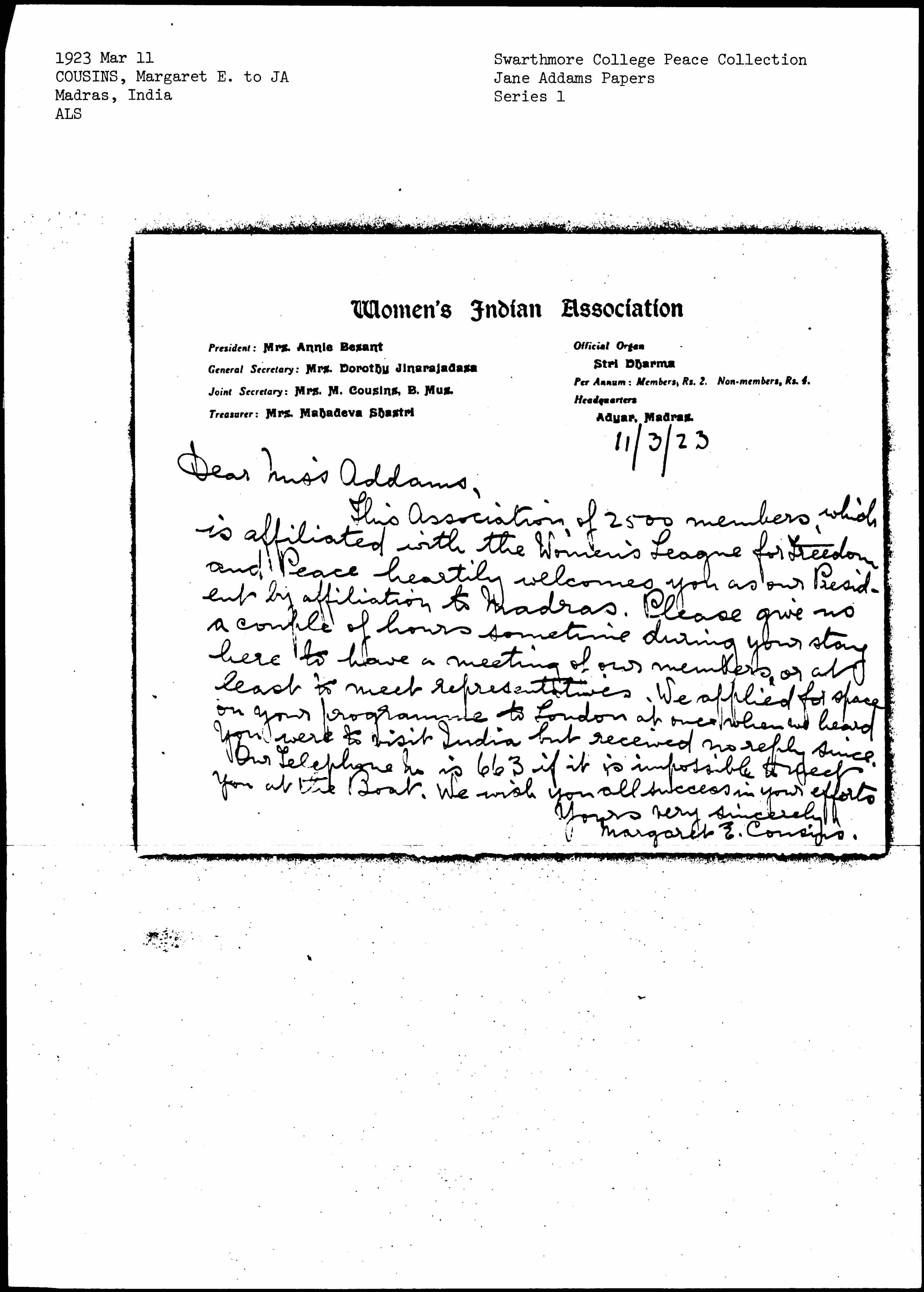 This Association of 2500 members, which is affiliated with the Women's League for Freedom and Peace heartily welcomes you as our President by affiliation to Madras. Please give us a couple of hours sometime during your stay here to have a meeting of our members, or at least to meet representatives. We applied for space in your [program] to London at once when we heard you were to visit India but received no reply since. Our Telephone No. is 663 if it is impossible to meet you at the Boat. We wish you all success in your efforts.