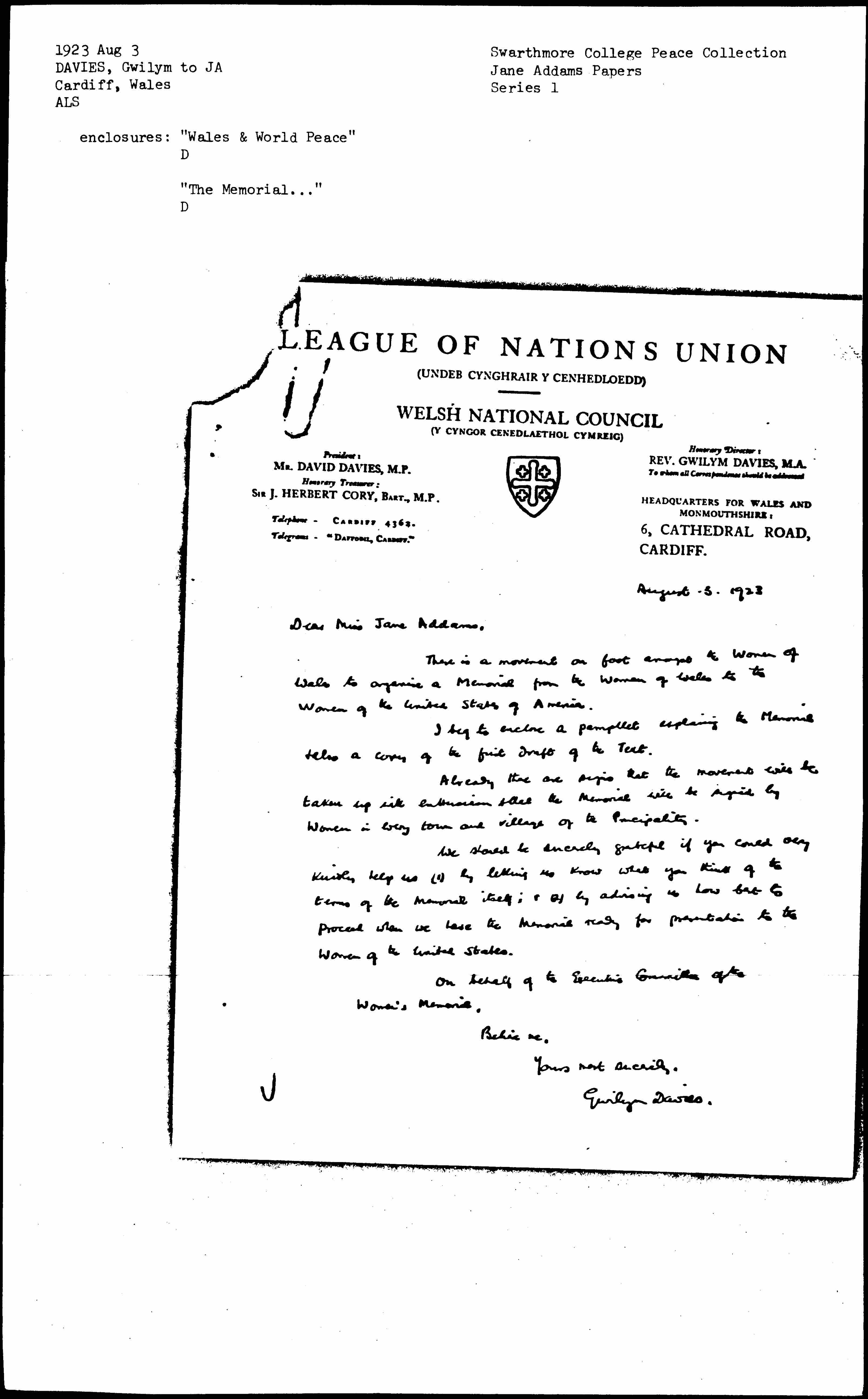 Already there are signs that the movement will be taken up with enthusiasm & that the Memorial will be signed by Women in every town and village of the Principality.