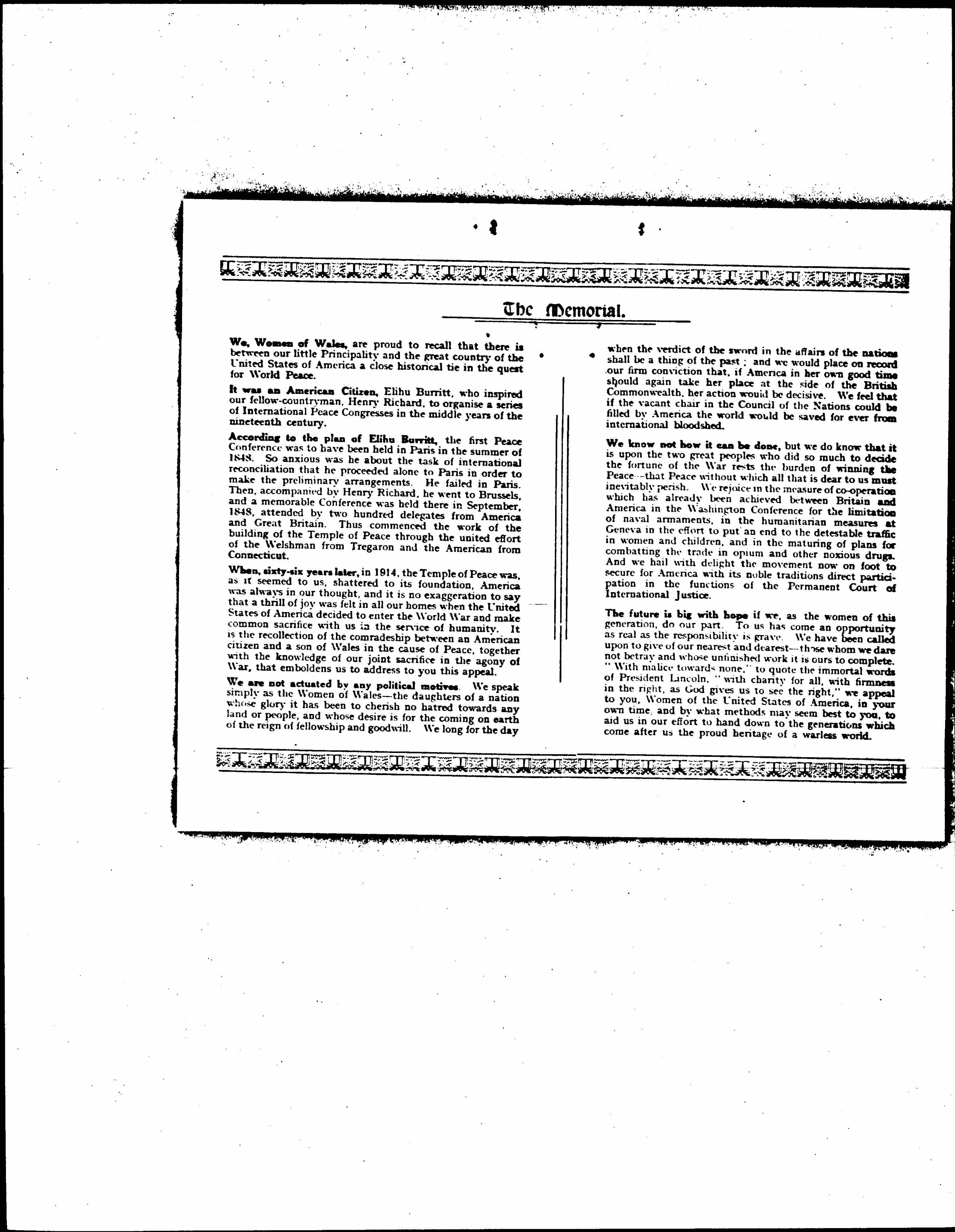 We are not actuated by any political motives. We speak simply as the Women of Wales -- the daughters of a nation whose glory it has been to cherish no hatred towards any land or people, and whose desire is for the coming on earth of the reign of fellowship and goodwill. We long for the day [page 3] when the verdict of the sword in the affairs of the nations shall be a thing of the past; and we would place on record our firm conviction that, if America in her own good time should again take her place at the side of the British commonwealth, her action would be decisive. We feel that if the vacant chair in the Council of the Nations could be filled by America the world would be saved for ever from international bloodshed.