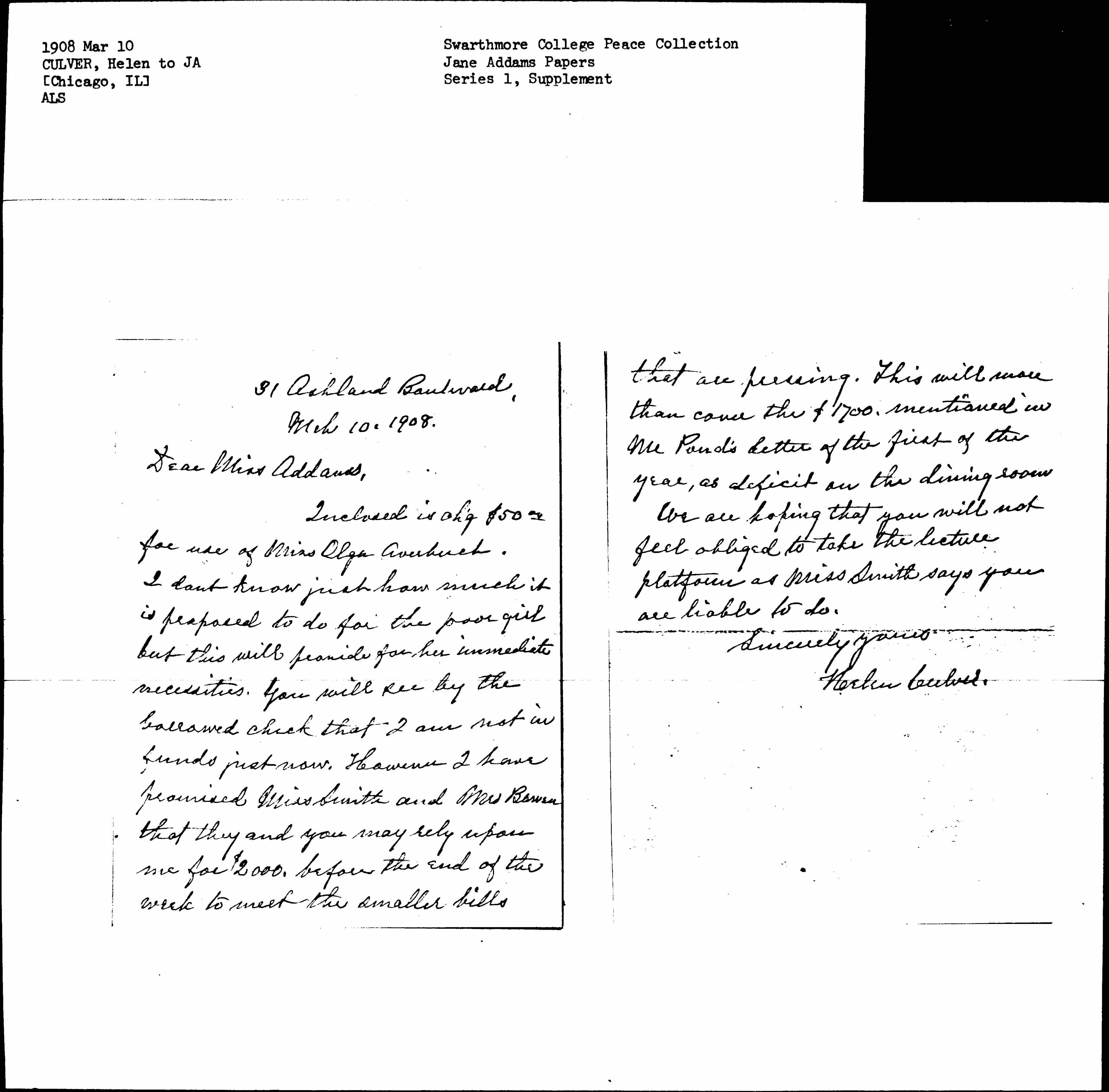 [Enclosed] is chq $50.00 for use of Miss Olga Averbuch. I don't know just how much it is proposed to do for the poor girl but this will provide for her immediate necessities. You will see by the borrowed check that I am not in funds just now. However I have promised Miss Smith and Mrs Bowen that they and you may rely upon me for $2000, before the end of the week to meet the smaller bills [page 2] that are pressing. This will more than cover the $1700. mentioned in Mr Pond's letter of the first of the year, as deficit on the dining room.