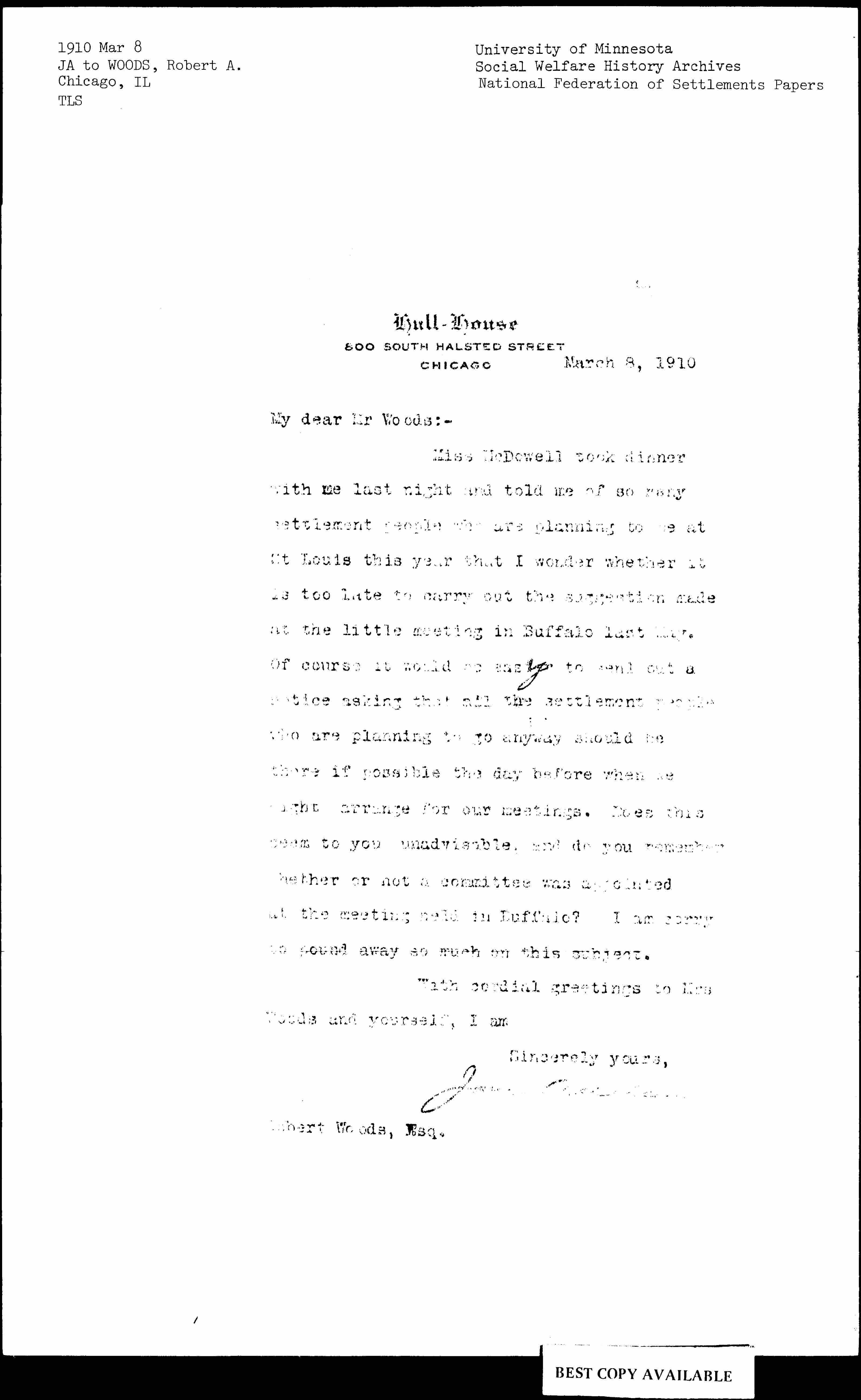 Miss McDowell took dinner with me last night and told me of so many settlement people who are planning to be at St Louis this year that I wonder whether it is too late to carry out the suggestion made at the little meeting in Buffalo last May. Of course it would be easy to send out a notice asking that all the settlement people who are planning to go anyway should be there if possible the day before when we might arrange for our meetings. Does this seem to you unadvisable, and do you remember whether or not a committee was appointed at the meeting held in Buffalo? I am sorry to pound away so much on this subject.