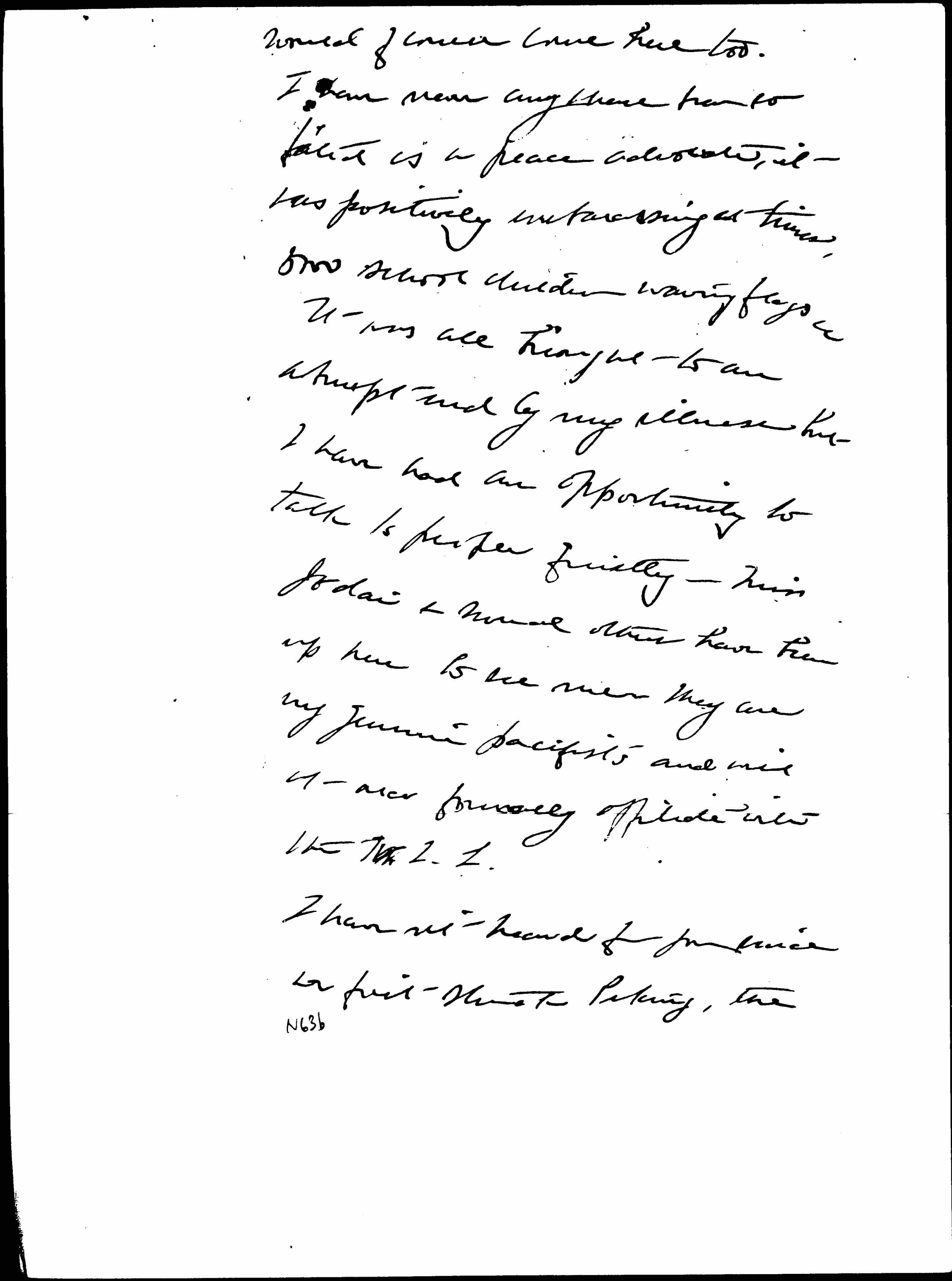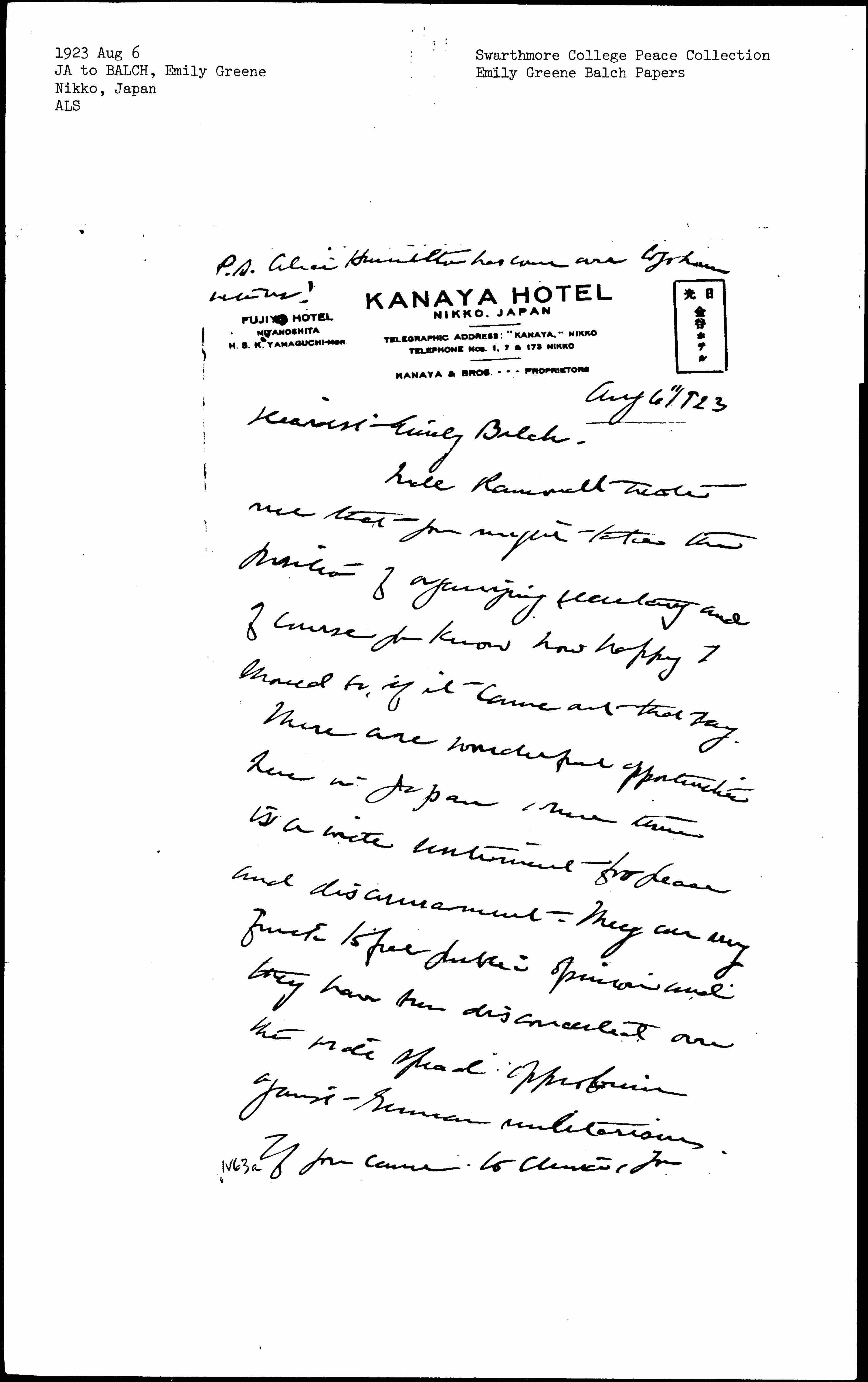 Mde Ramondt wrote me that you might take the position of organizing secretary and of course you know how happy I should be, if it came out that way. There are wonderful opportunities here in Japan where there is a wide sentiment for peace and disarmament. They are very quick to free public opinion and they have been disconcerted over the wide spread opprobrium against German militarism. If you came to China, you [page 2] would of course come here too. I have never anywhere been so feted as a peace advocate, it was positively [embarrassing] at times, 5000 school children waving flags [etc.] It was all brought to an abrupt end by my illness but I have had an opportunity to talk to people quietly -- Miss Jōdai & several others have been up here to see me. They are very genuine pacifists and will at once formally affiliate with the W.I.L.