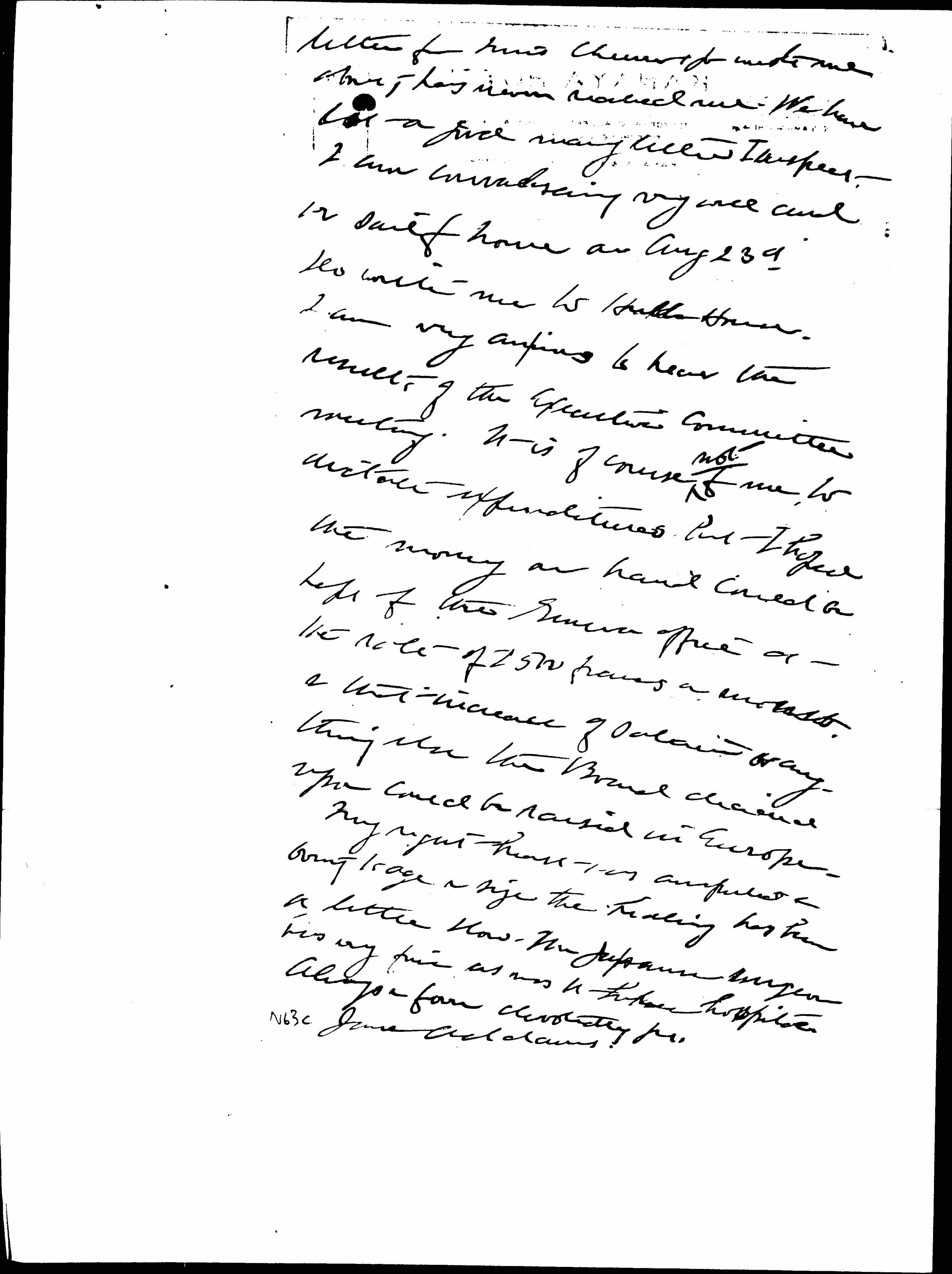 Do write me to Hull-House. I am very anxious to hear the results of the Executive Committee meeting. It is of course ↑not↓ for me to dictate expenditures but I hoped the money on hand could be left for the Geneva office at the rate of 2500 francs a month, & that increase of salaries or anything else the Board decided upon could be raised in Europe.