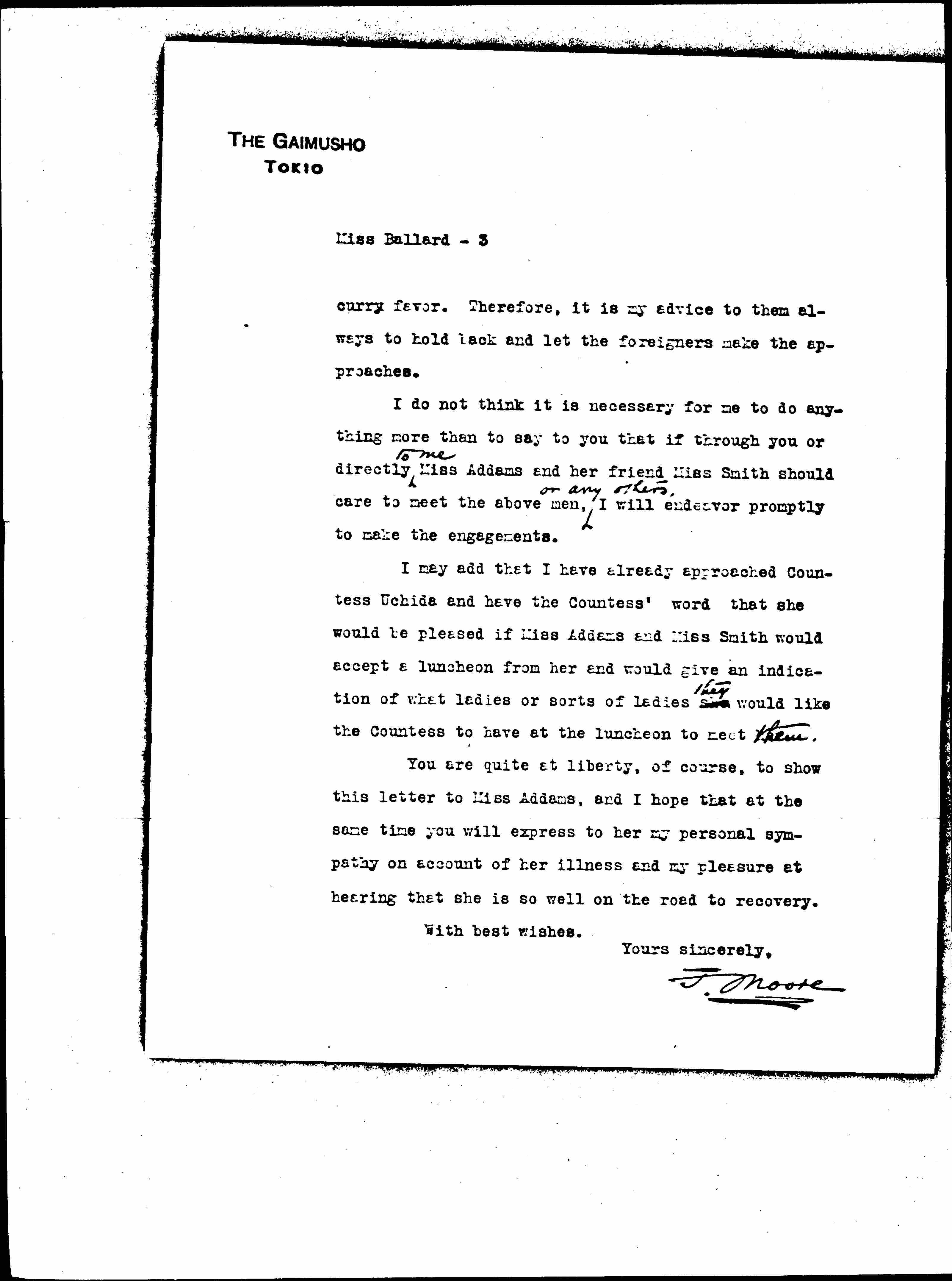 I may add that I have already approached Countess Uchida and have the Countess' word that she would be pleased if Miss Addams and Miss Smith would accept a luncheon from her and would give an indication of what ladies or sorts of ladies she ↑they↓ would like the Countess to have at the luncheon to meet them.