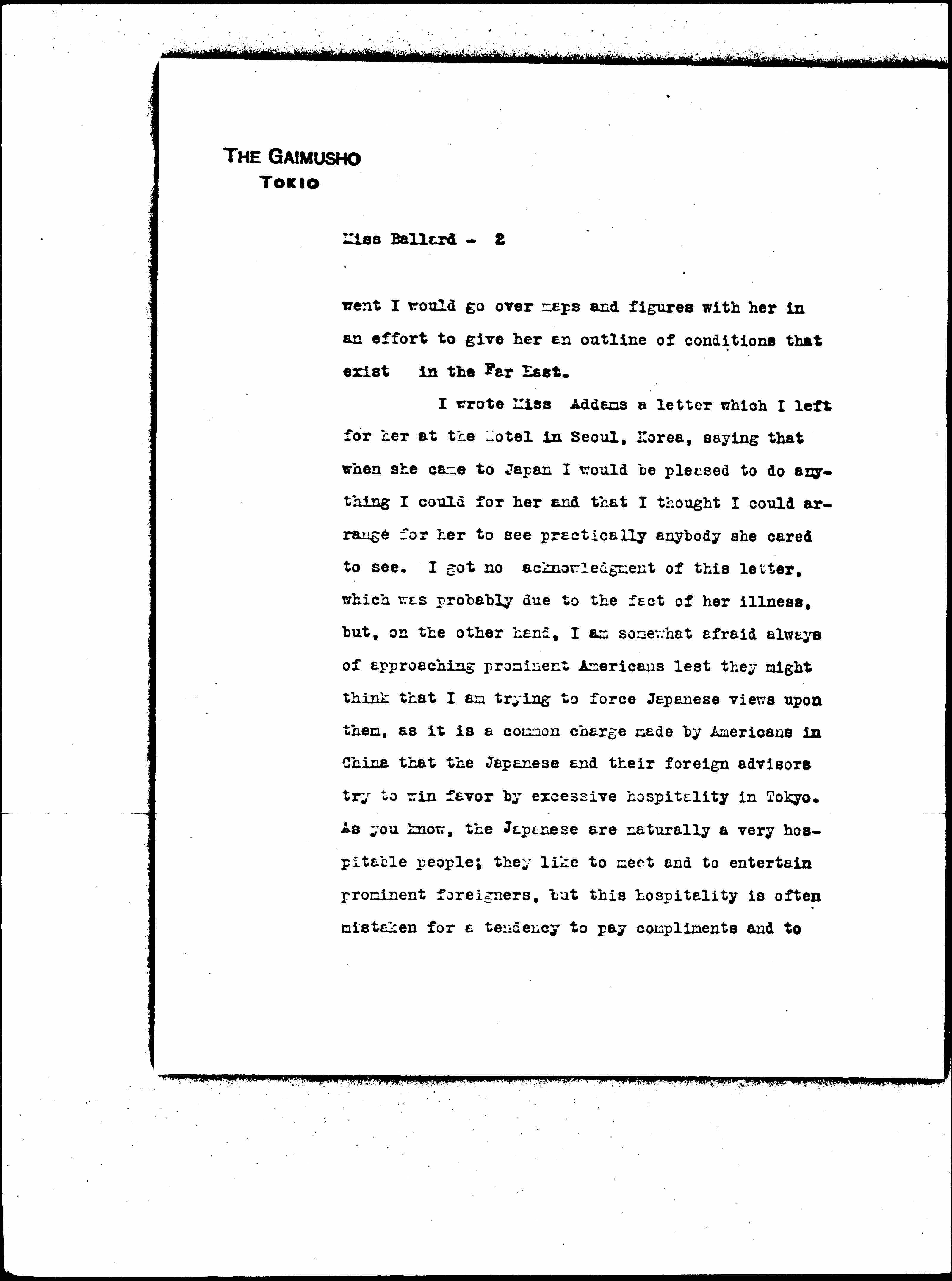 I wrote Miss Addams a letter which I left for her at the Hotel in Seoul, Korea, saying that when she came to Japan I would be pleased to do anything I could for her and that I thought I could arrange for her to see practically anybody she cared to see. I got no acknowledgment of this letter, which was probably due to the fact of her illness, but, on the other hand, I am somewhat afraid always of approaching prominent Americans lest they might think that I am trying to force Japanese views upon them, as it is a common charge made by Americans in China that the Japanese and their foreign advisors try to win favor by excessive hospitality in Tokyo. As you know, the Japanese are naturally a very hospitable people; they like to meet and to entertain prominent foreigners, but this hospitality is often mistaken for a tendency to pay compliments and to [page 3] curry favor. Therefore, it is my advice to them always to hold back and let the foreigners make the approaches.