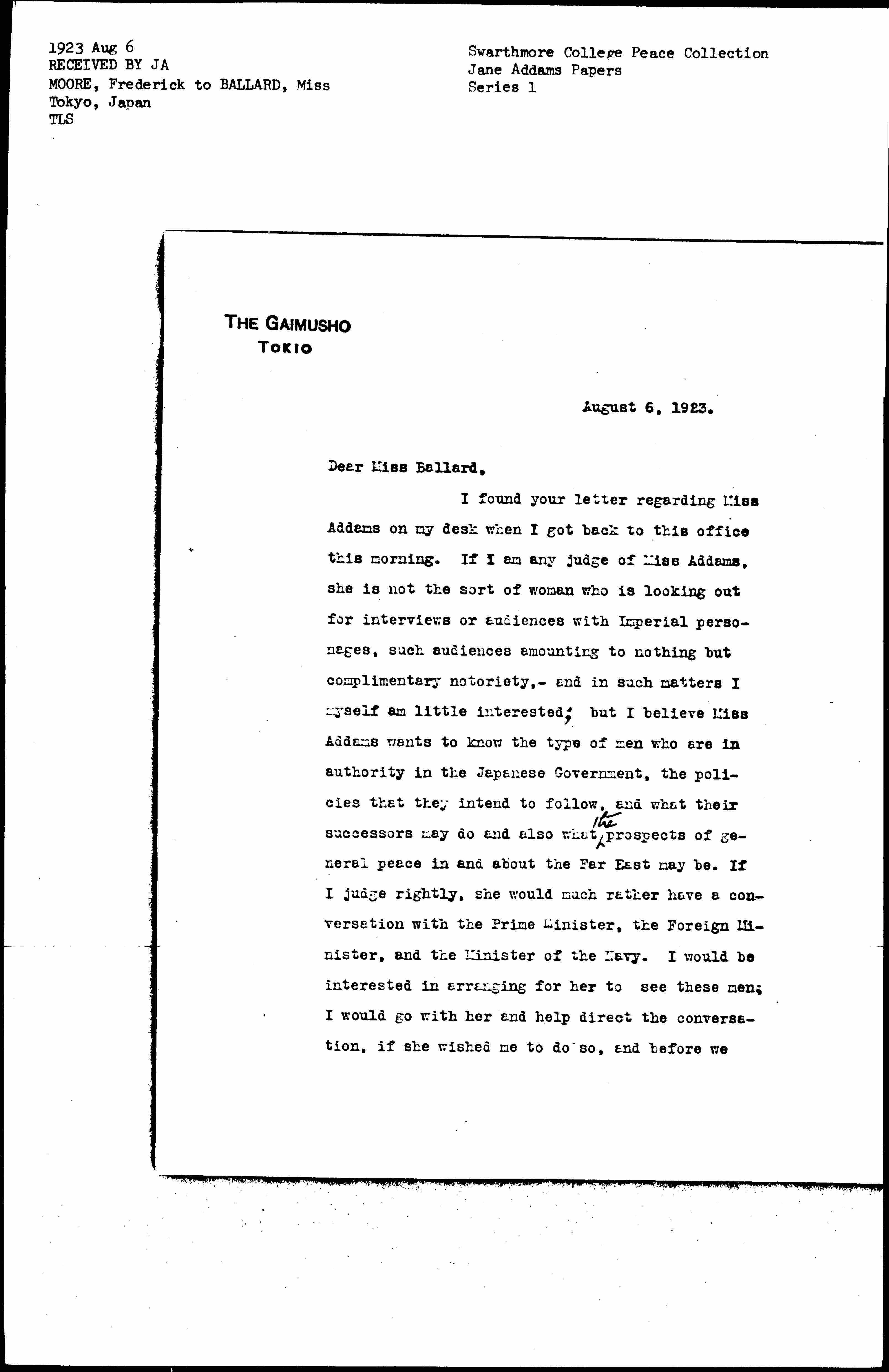 I found your letter regarding Miss Addams on my desk when I got back to this office this morning. If I am any judge of Miss Addams, she is not the sort of woman who is looking out for interviews or audiences with Imperial personages, such audiences amounting to nothing but complimentary notoriety, -- and in such matters I myself am little interested; but I believe Miss Addams wants to know the type of men who are in authority in the Japanese Government, the policies that they intend to follow, and what their successors may do and also what ↑the↓ prospects of general peace in and about the Far East may be. If I judge rightly, she would much rather have a conversation with the Prime Minister, the Foreign Minister, and the Minister of the Navy. I would be interested in arranging for her to see these men; I would go with her and help direct the conversation, if she wished me to do so, and before we [page 2] went I would go over maps and figures with her in an effort to give her an outline of conditions that exist in the Far East.