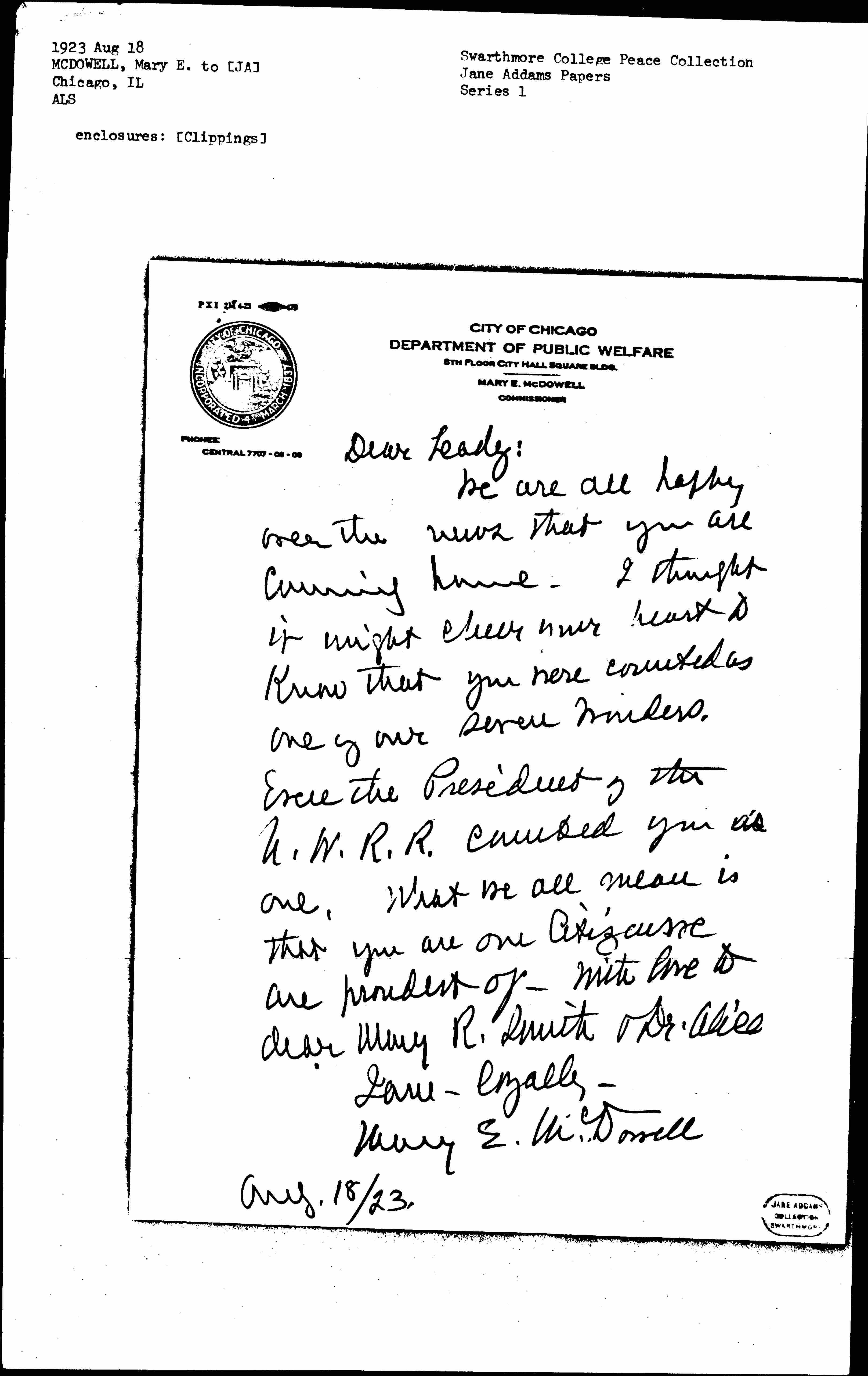 We are all happy over the news that you are coming home. I thought it might cheer your heart to know that you were counted as one of our seven wonders. Even the President of the U.W.R.R. counted you as one. What we all mean is that you are one Citizen we are proudest of. With love to dear Mary R. Smith & Dr. Alice
