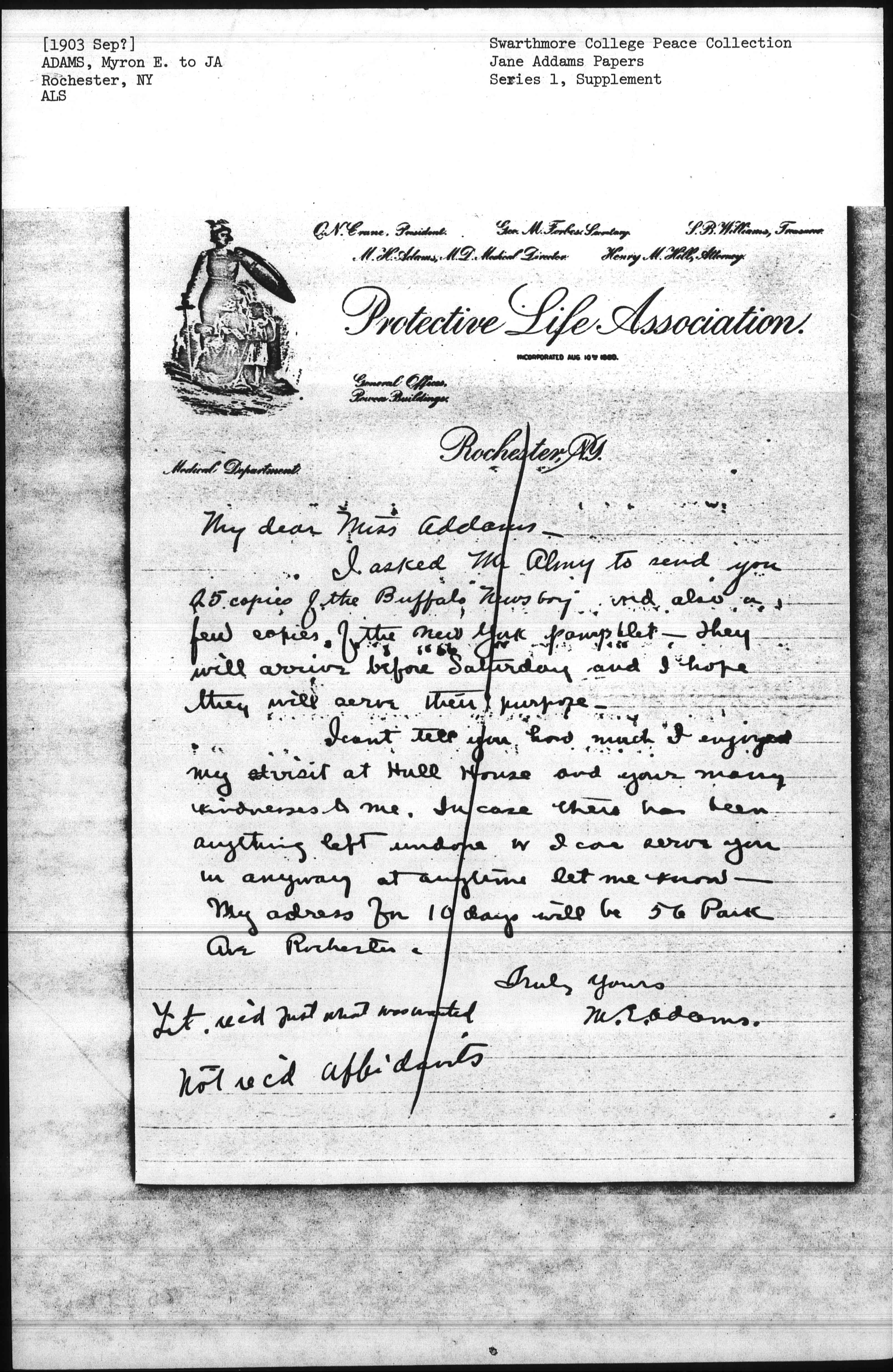 I asked Mr Almy to send you 25 copies of the Buffalo "Newsboy" and also a few copies of the New York pamphlet. They will arrive before Saturday and I hope they will serve their purpose.