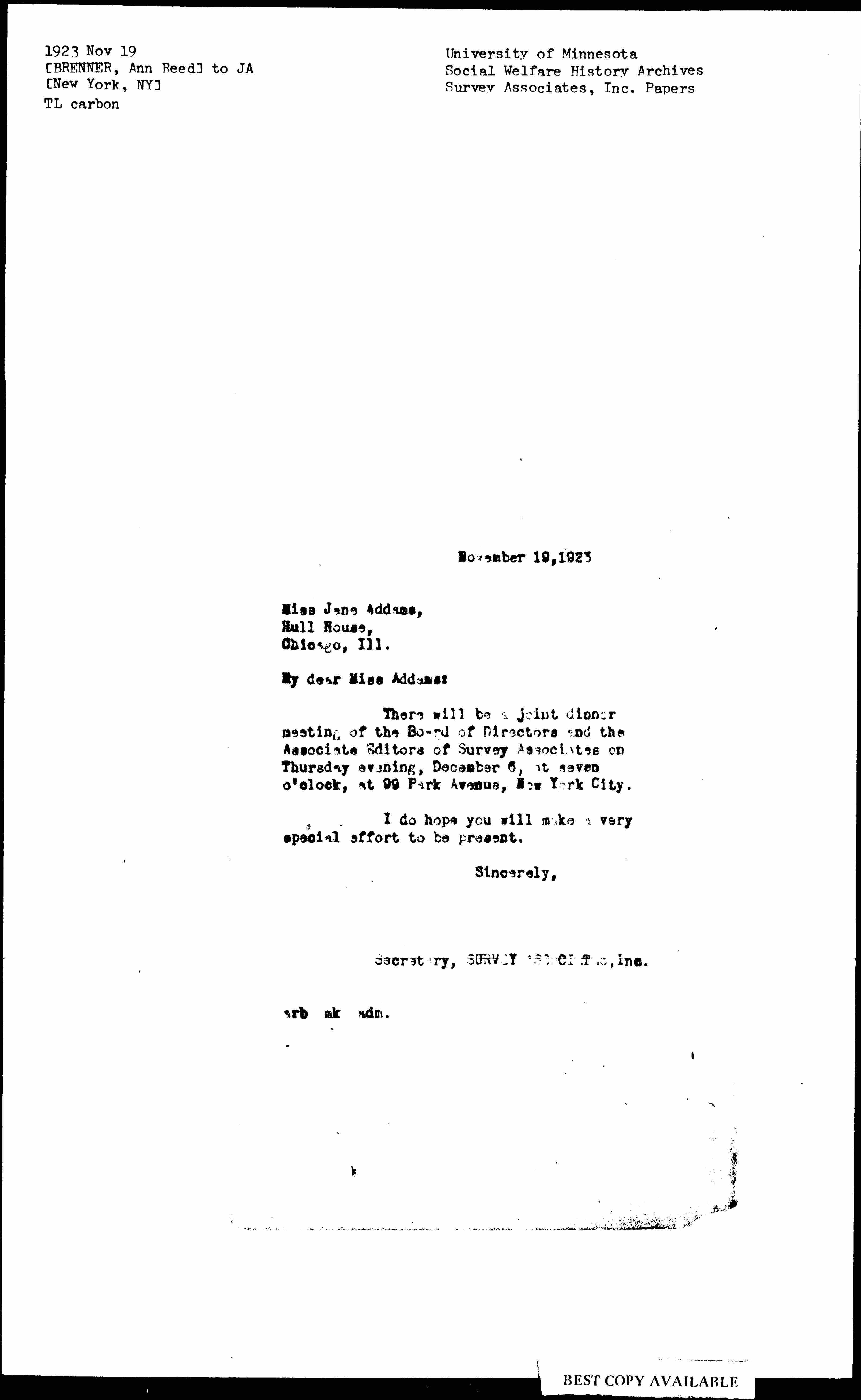 There will be a joint dinner meeting of the Board of Directors and the Associate Editors of Survey Associates on Thursday evening, December 6, at seven o'clock, at 99 Park Avenue, New York City.