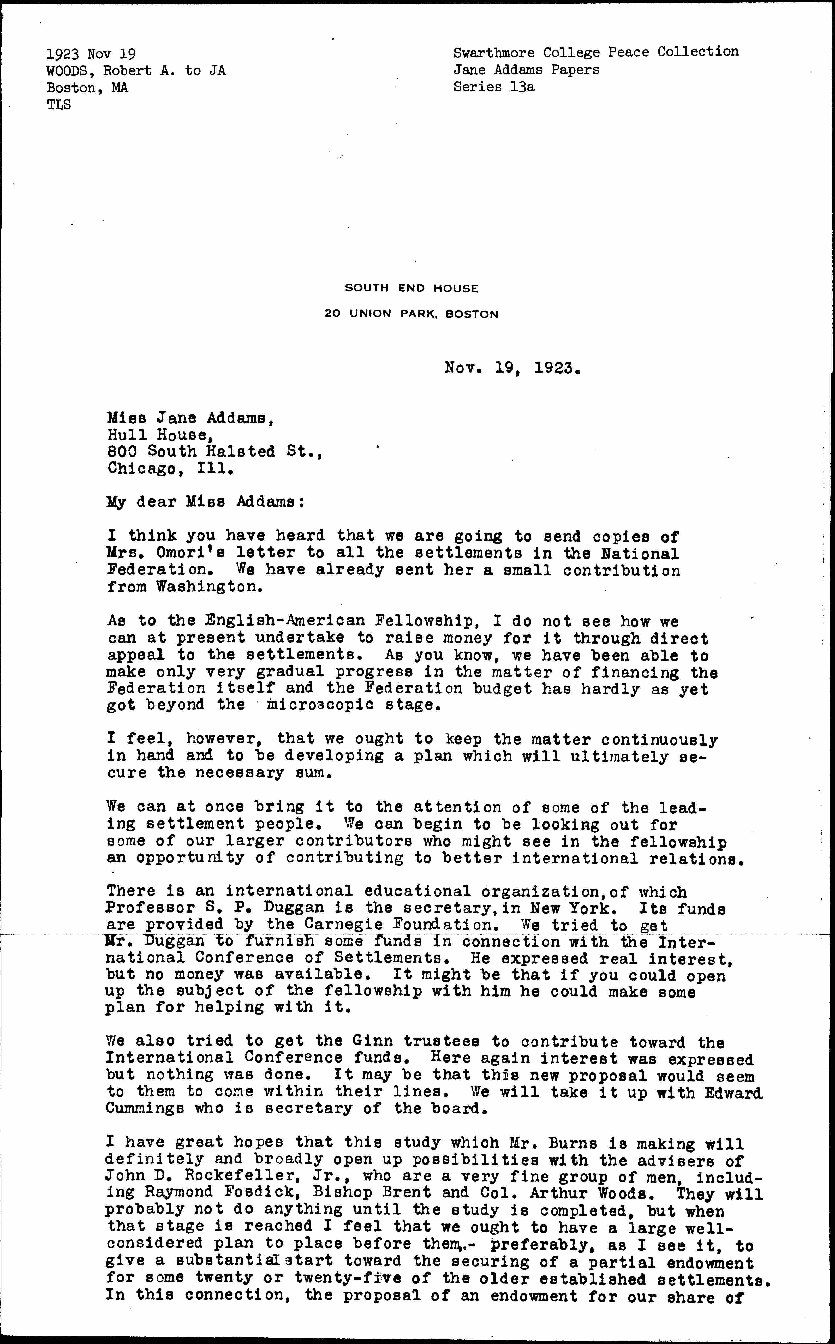 I have great hopes that this study which Mr. Burns is making will definitely and broadly open up possibilities with the advisers of John D. Rockefeller, Jr., who are a very fine group of men, including Raymond Fosdick, Bishop Brent and Col. Arthur Woods. They will probably not do anything until the study is completed, but when that stage is reached I feel that we ought to have a large well-considered plan to place before them -- preferably, as I see it, to give a substantial start toward the securing of a partial endowment for some twenty or twenty-five of the older established settlements. In this connection, the proposal of an endowment for our share of [page 2] the international fellowship could very naturally be included.
