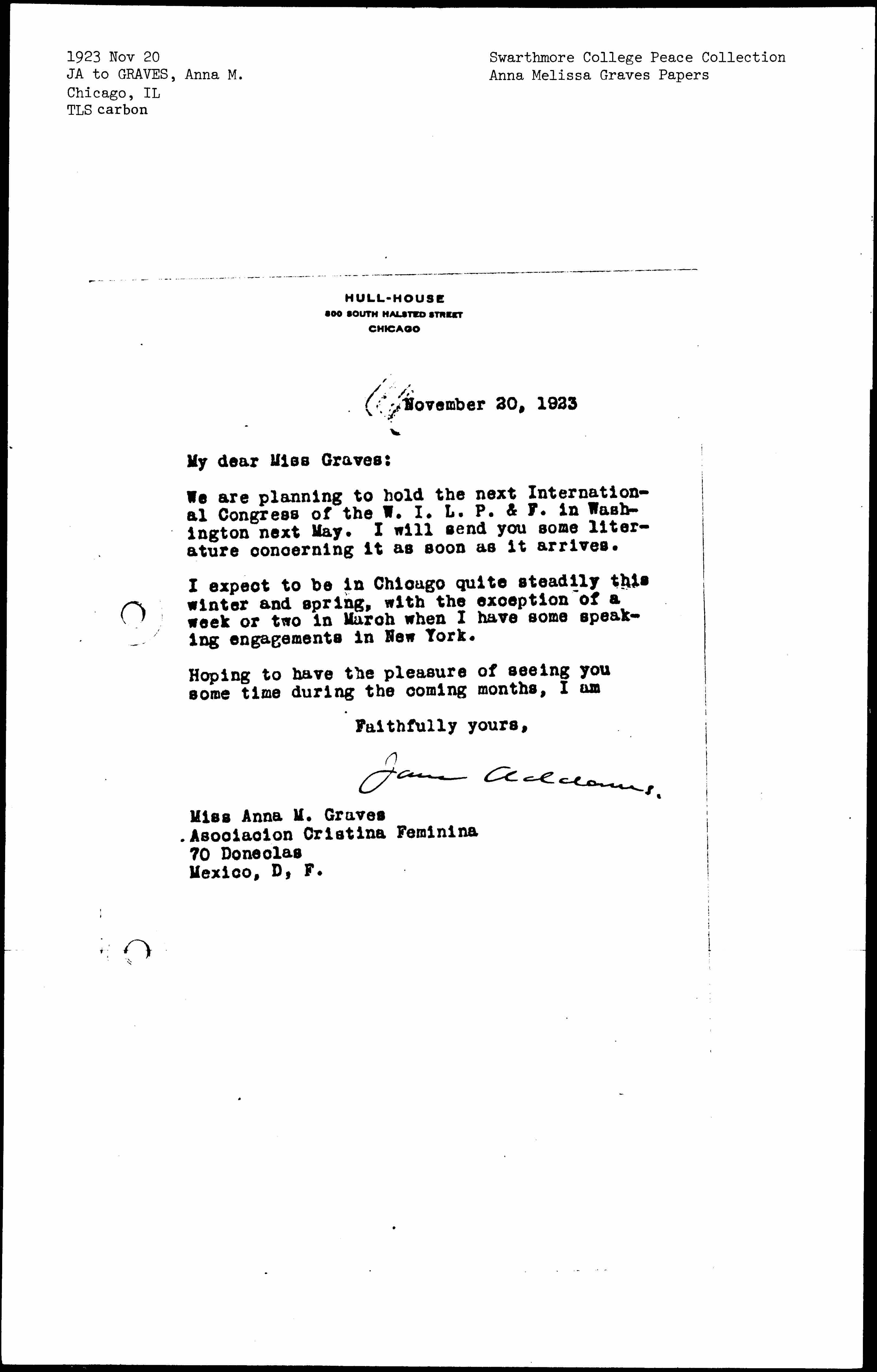 We are planning to hold the next International Congress of the W.I.L.P. & F. in Washington next May. I will send you some literature concerning it as soon as it arrives.