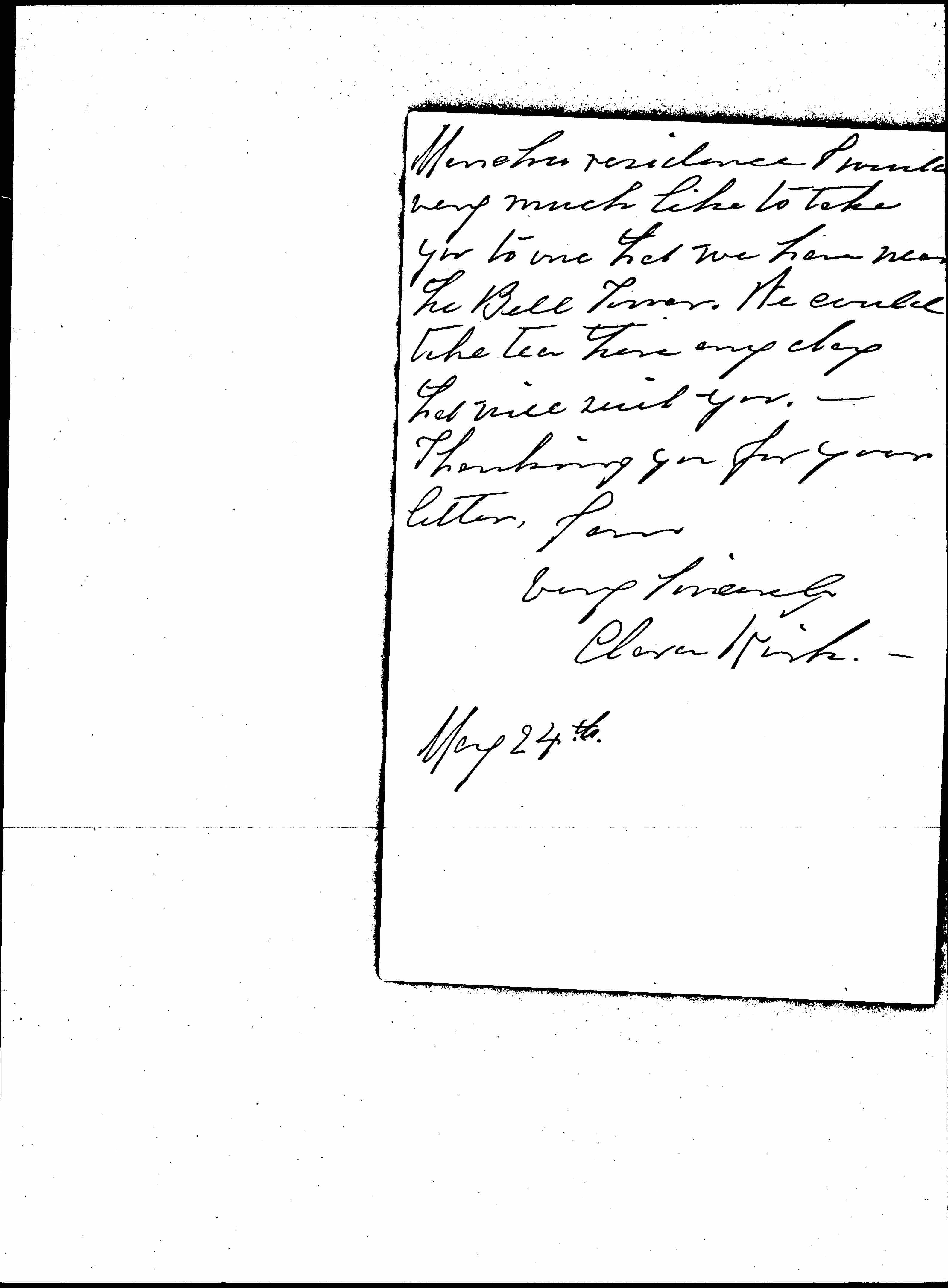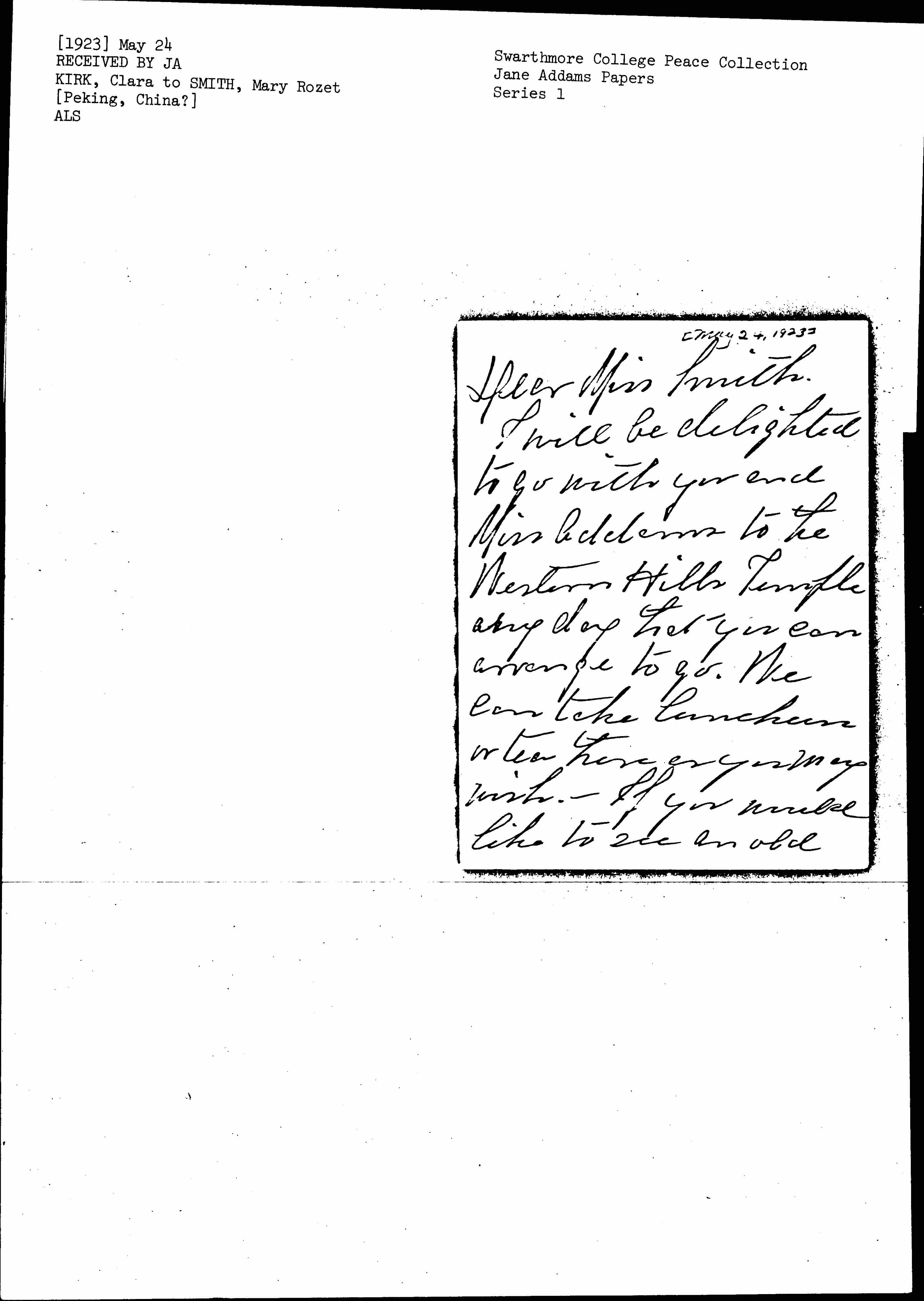 I will be delighted to go with you and Miss Addams to the Western Hills Temple any day that you can arrange to go. We can take luncheon or tea here as you may wish. If you would like to see an old [page 2] [Manchu?] residence I would very much like to take you to one that we have near the Bell Tower. We could take tea here any day that will suit you.
