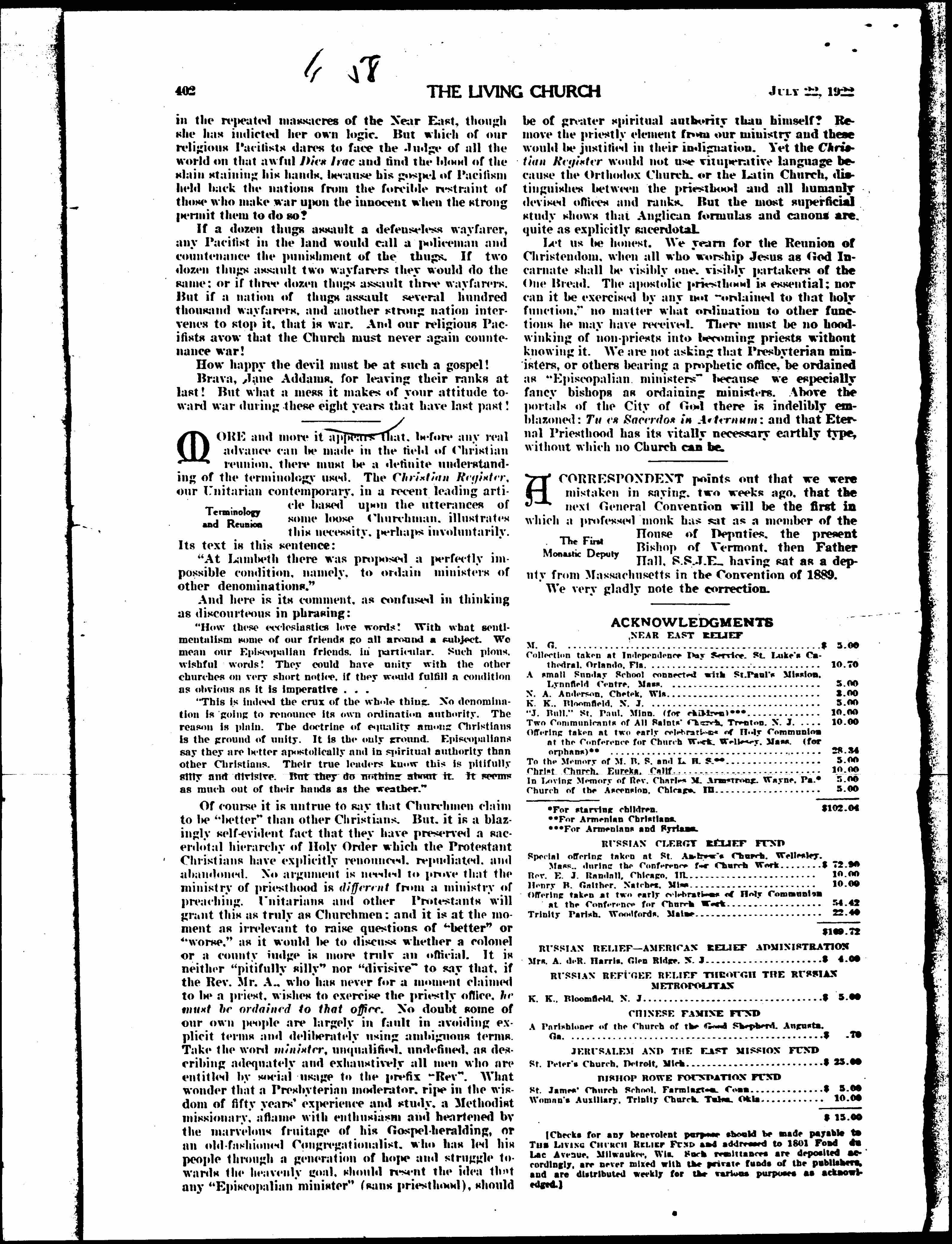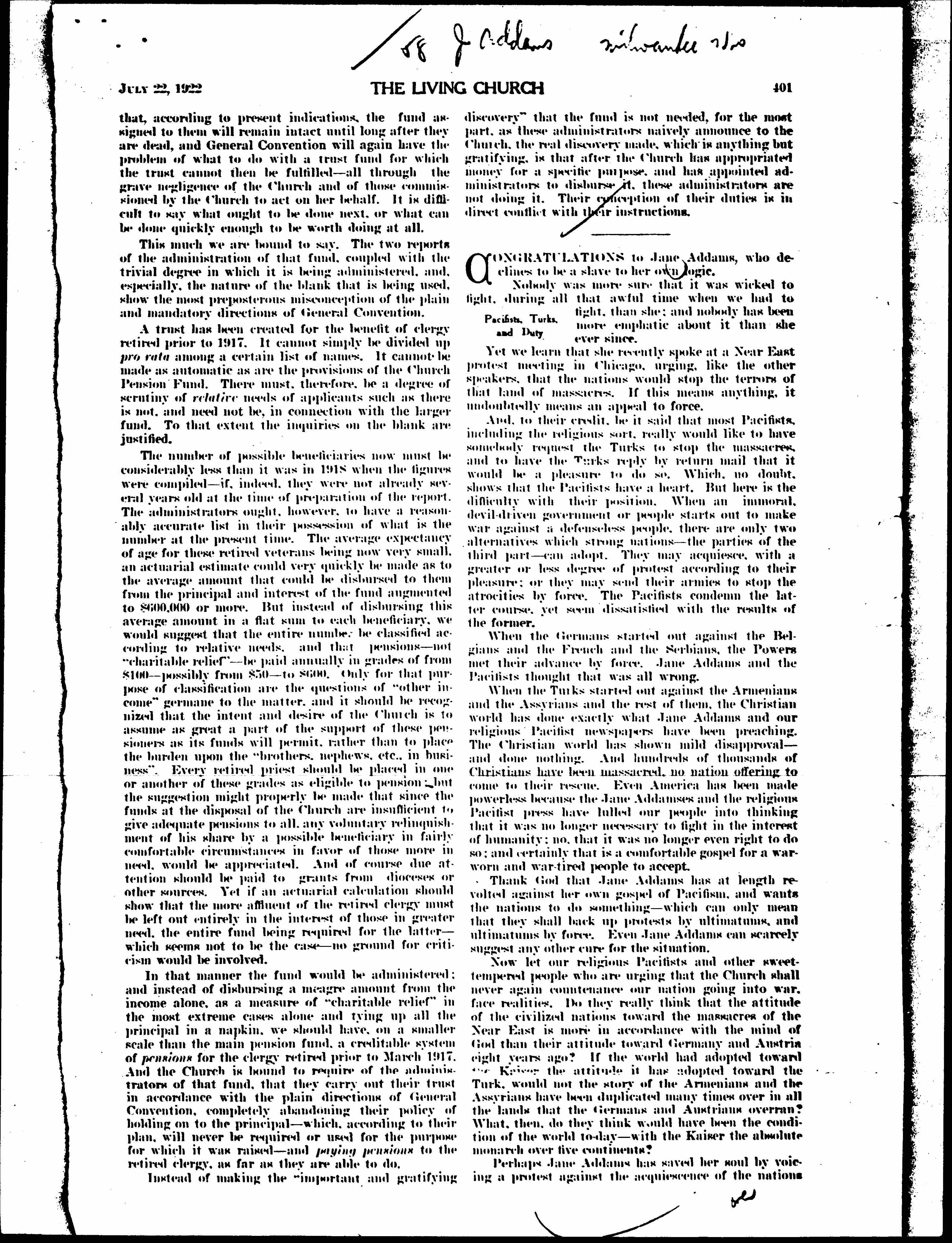 Perhaps Jane Addams has saved her soul by voicing a protest against the acquiescence of the nations [page 2] in the repeated massacres of the Near East, though she has indicted her own logic. But which of our religious Pacifists dares to face the Judge of all the world on that awful Dies Irae and find the blood of the slain staining his hands, because his gospel of Pacifism held back the nations from the forcible restraint of those who make war upon the innocent when the strong permit them to do so?