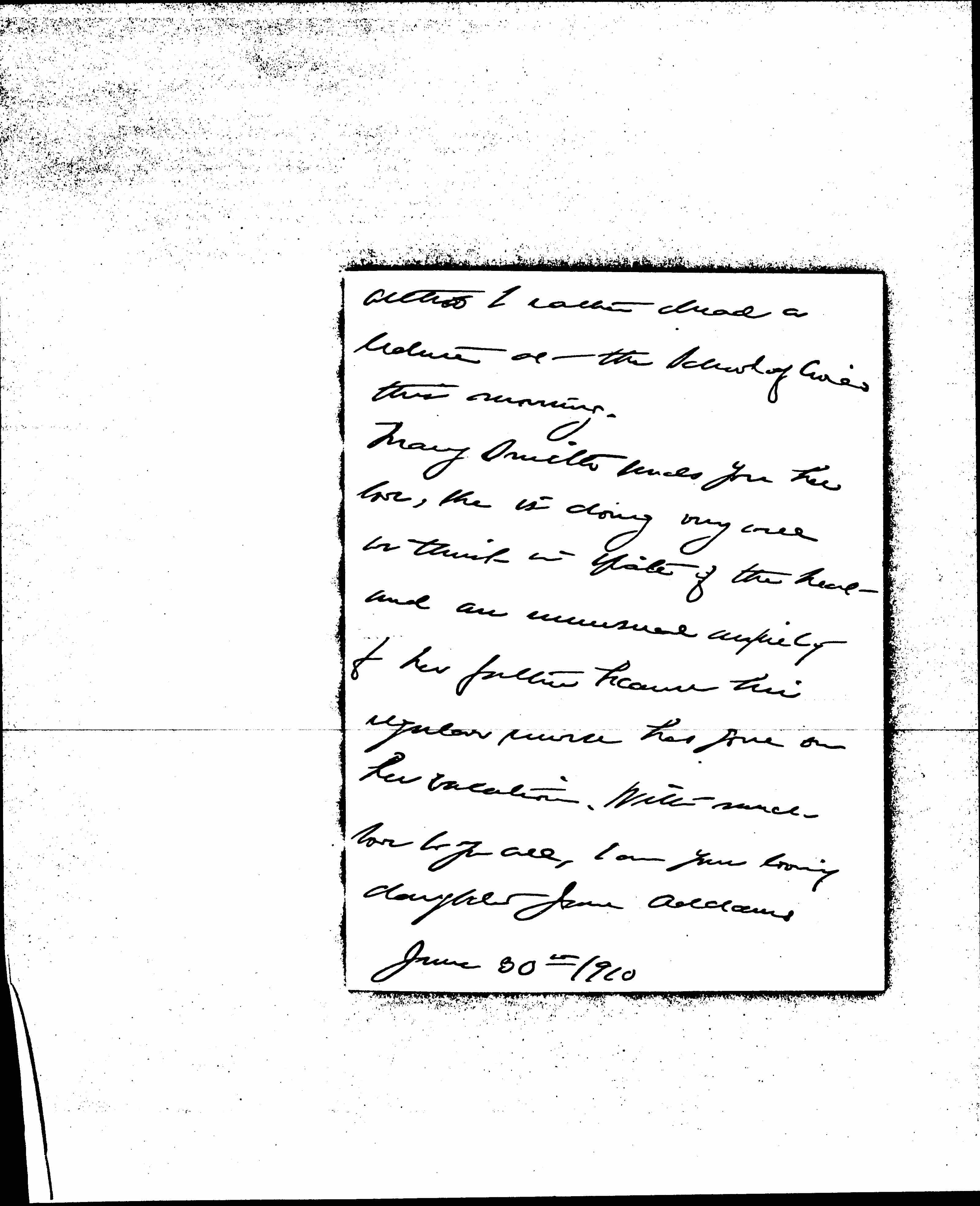 Mary Smith sends you her love, she is doing very well we think in spite of the heat and an unusual anxiety for her father because his regular nurse has gone on her vacation. With much love to you all, I am your loving daughter Jane Addams