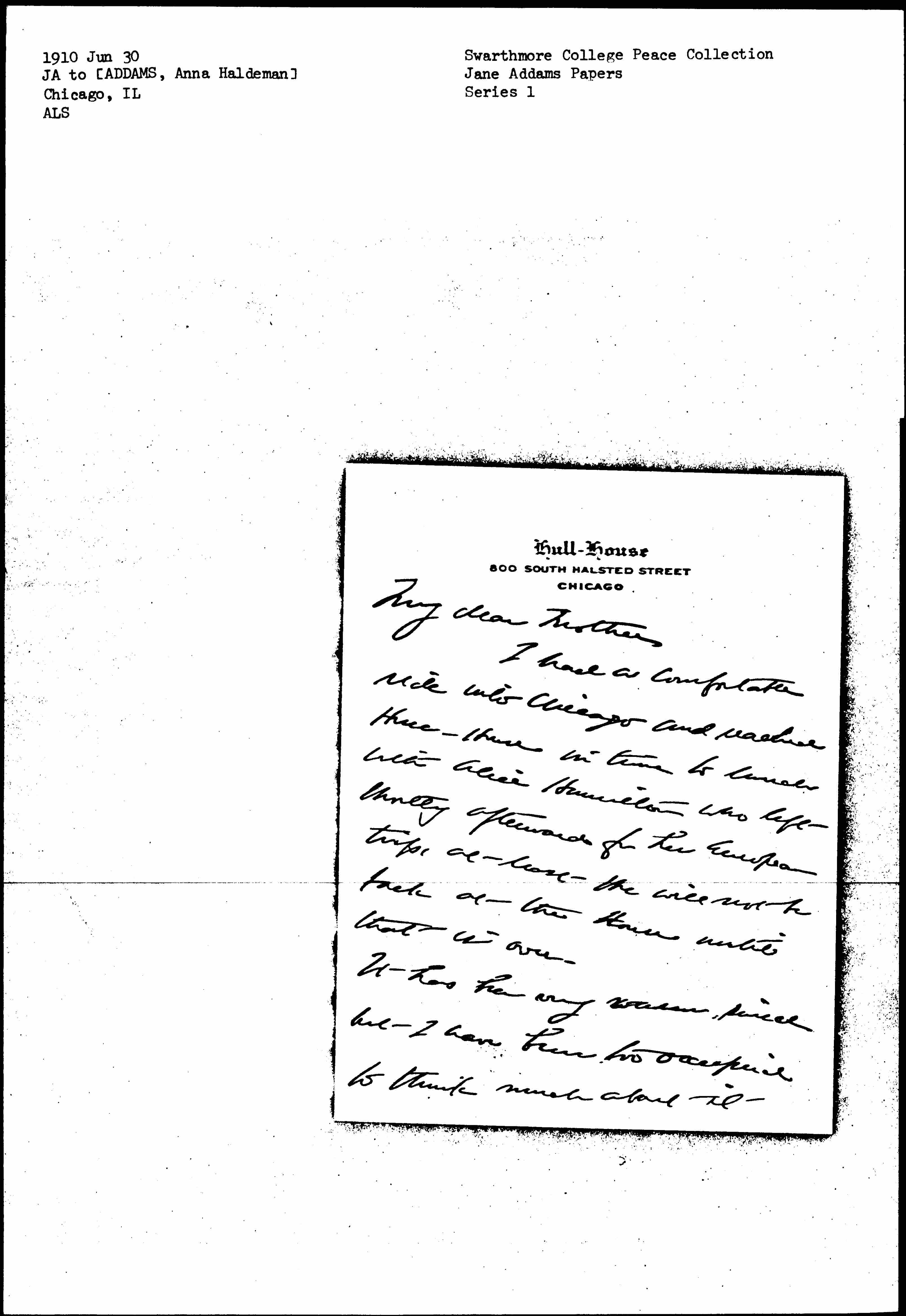 I had a comfortable ride into Chicago and reached Hull-House in time to lunch with Alice Hamilton who left shortly afterward for her European trip, at least she will not be back at the House until that is over.