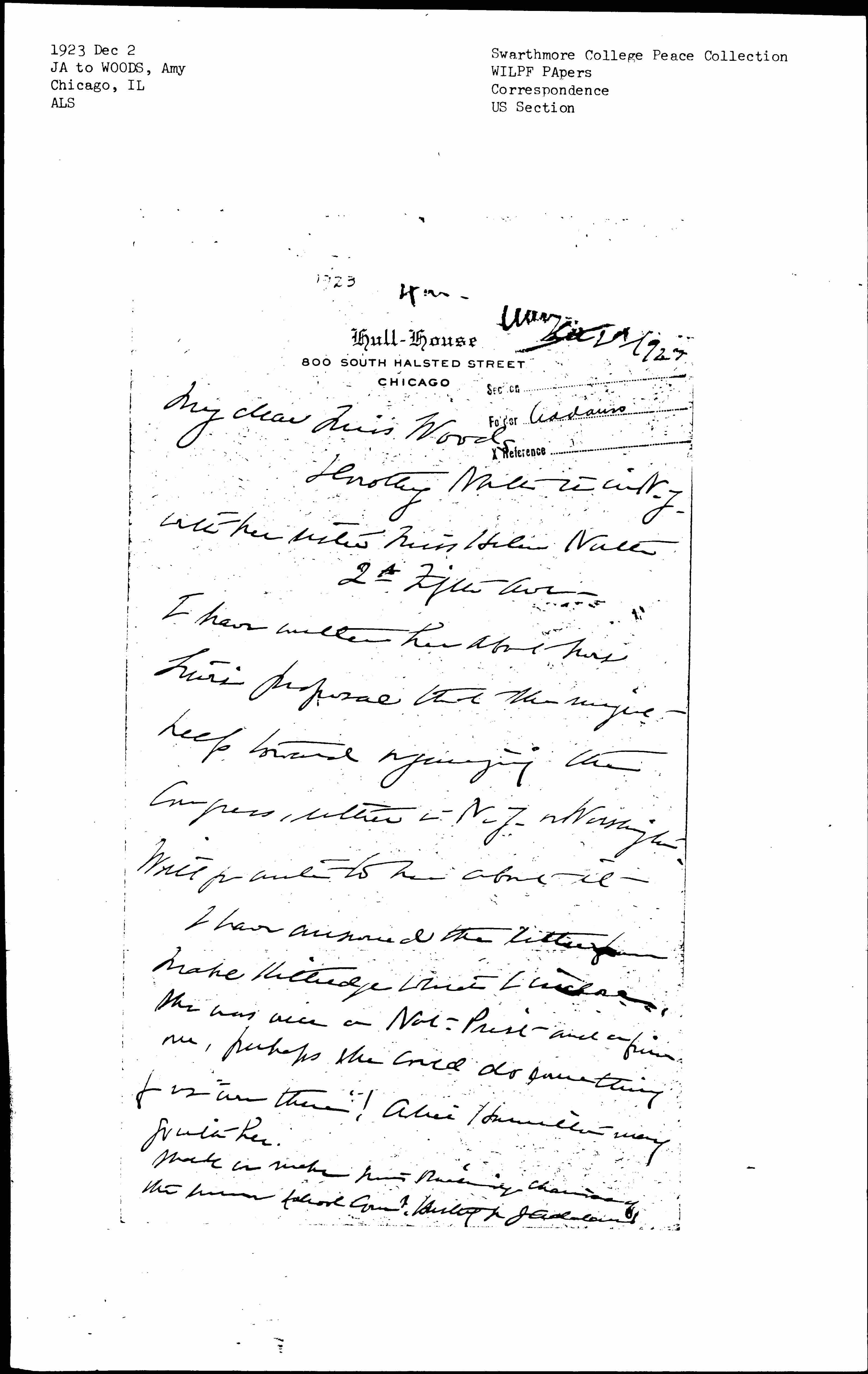 Shall we make Miss Breckinridge chairman of the Summer School Com? Hastily yours J. Addams