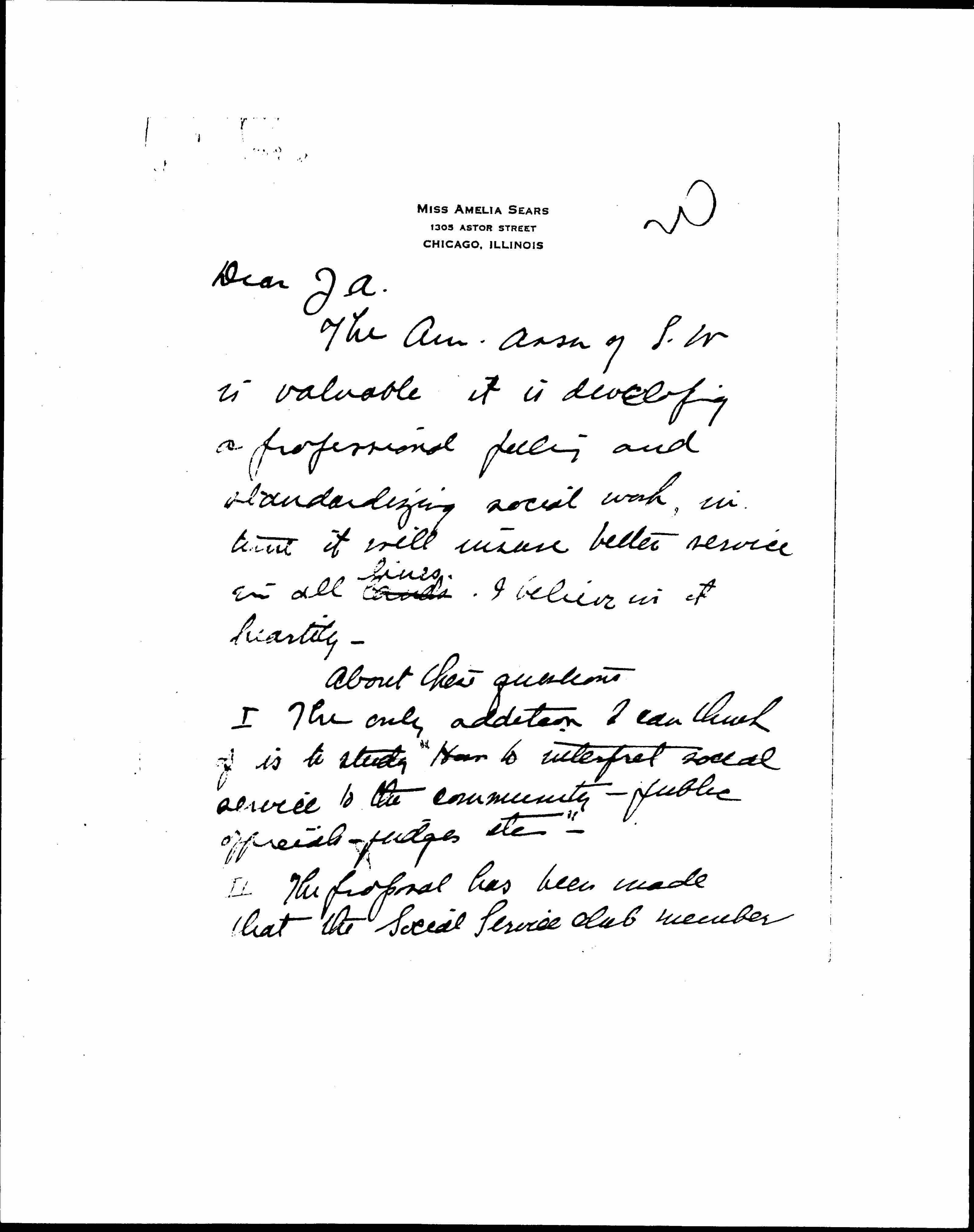 The Am. Assn of S.W. is valuable it is developing a professional [policy] and standardizing social work, in time it will insure better service in all lands ↑lines↓. I believe in it heartily.