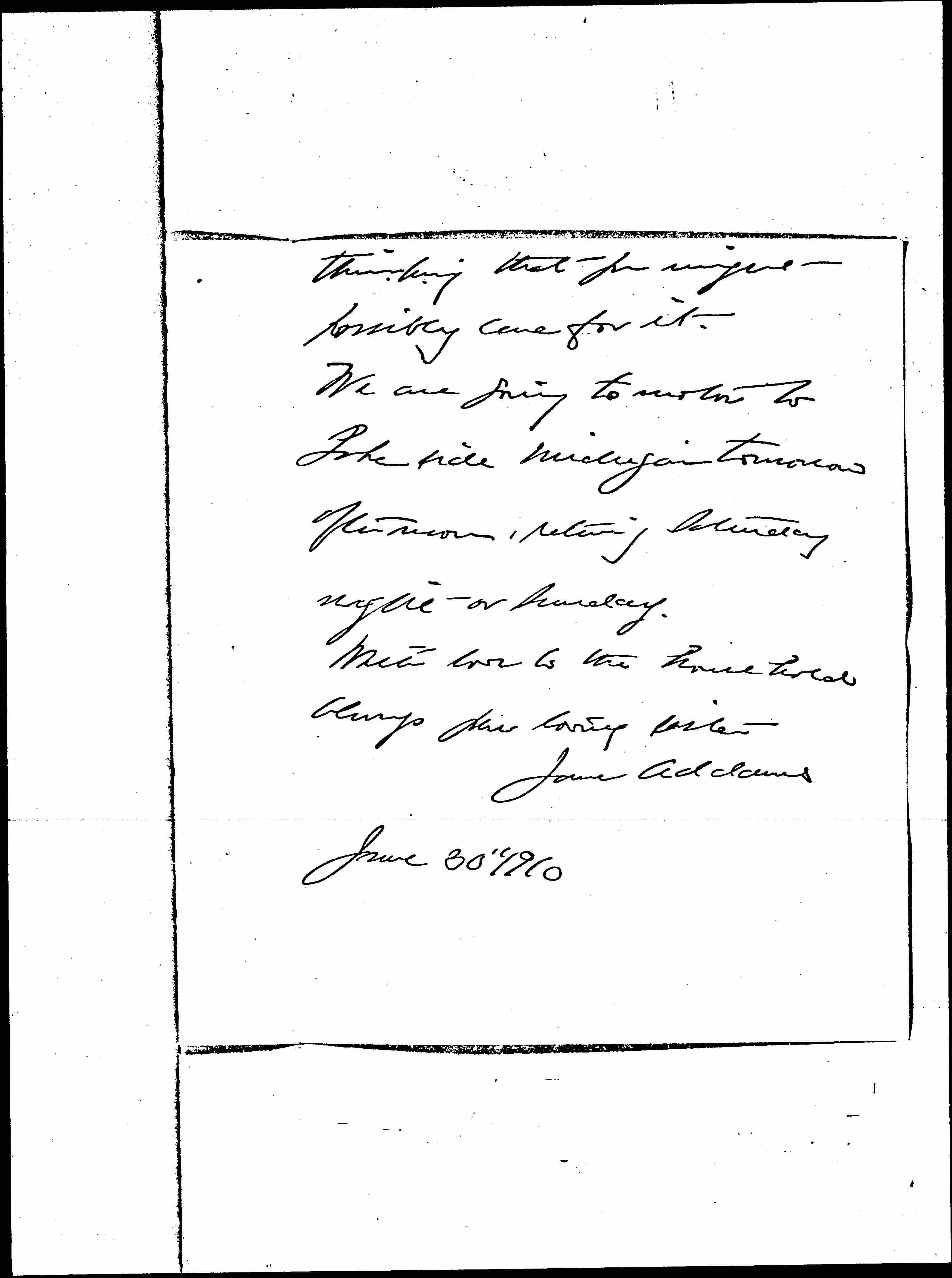 We are going to motor to Lakeside Michigan tomorrow afternoon, returning Saturday night or Sunday.