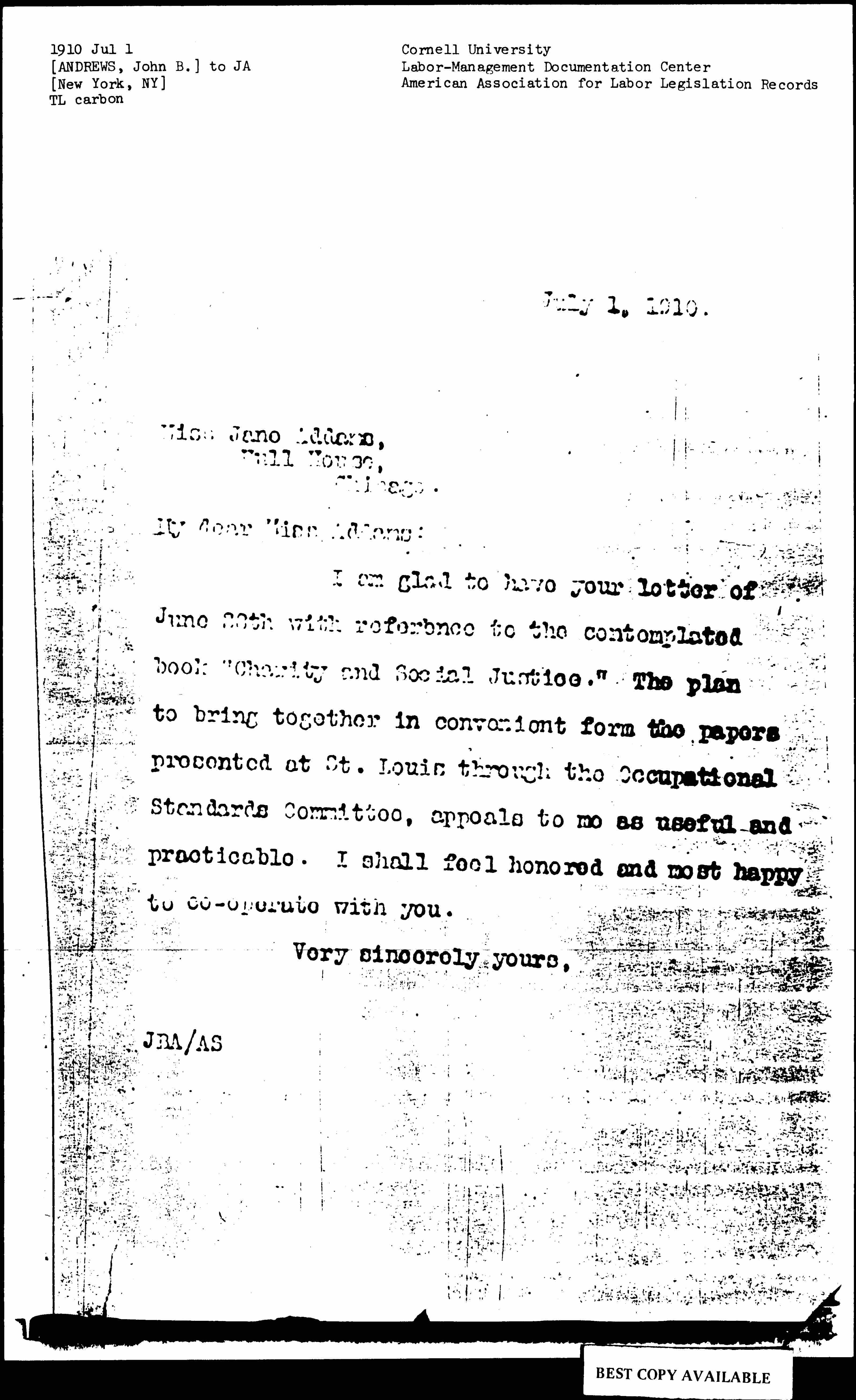 I am glad to have your letter of June 28th with reference to the contemplated book "Charity and Social Justice." The plan to bring together in convenient form the papers presented at St. Louis through the Occupational Standards Committee, appeals to me as useful and practicable. I shall feel honored and most happy to [cooperate] with you.