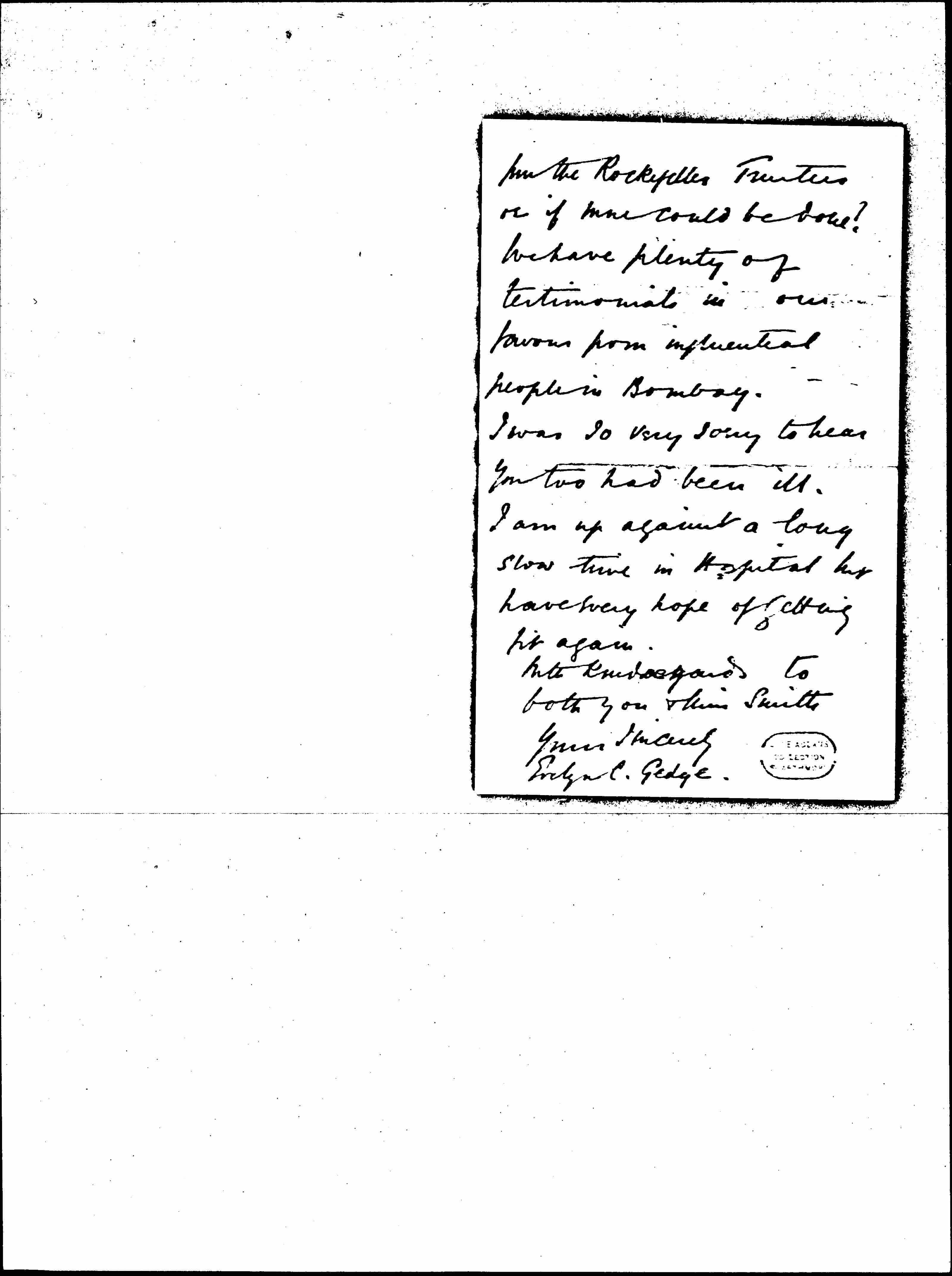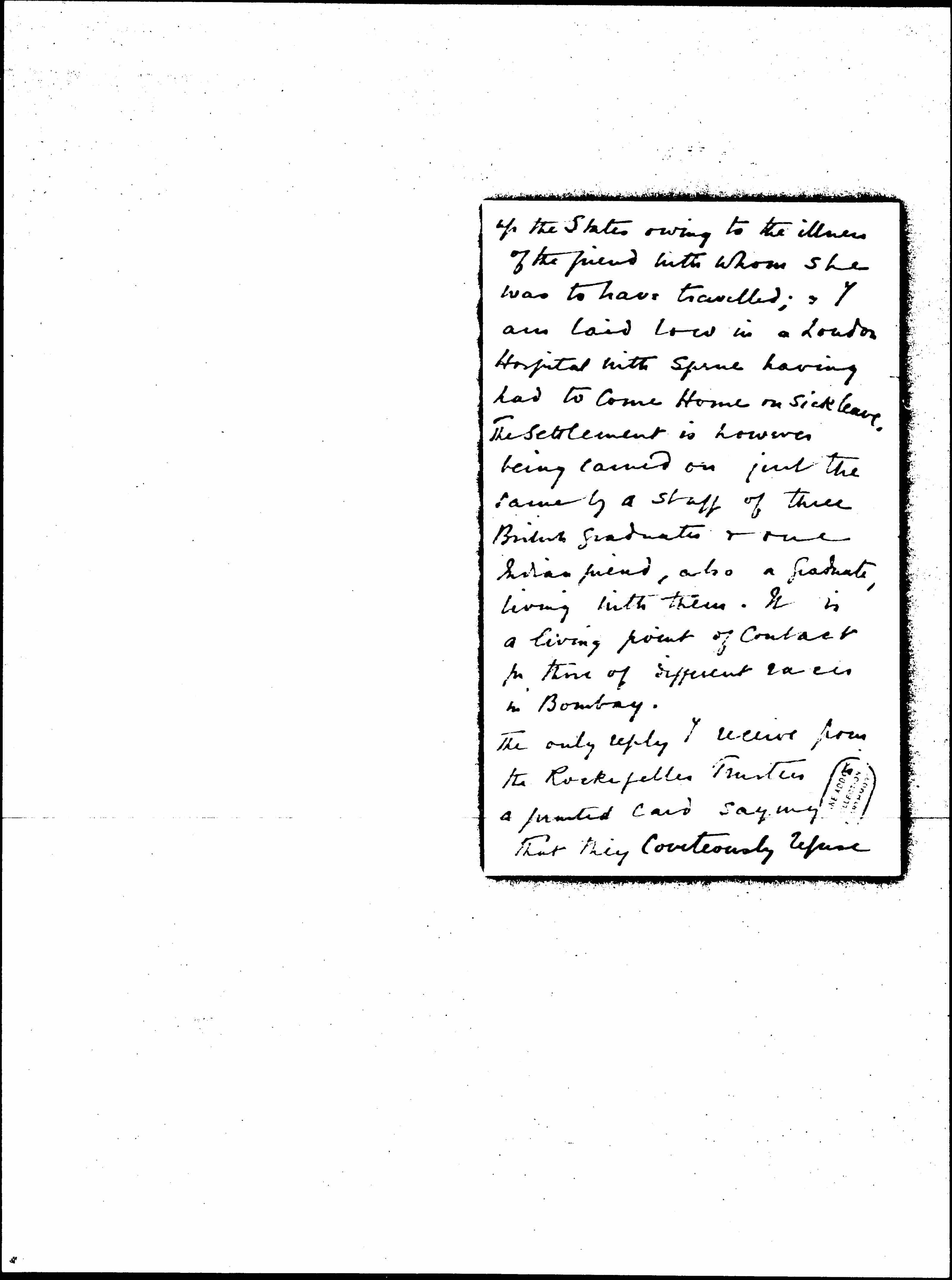 The only reply I recieve from the Rockefeller Trustees a printed card saying that they courteously refuse [page 3] to help us in Bombay.