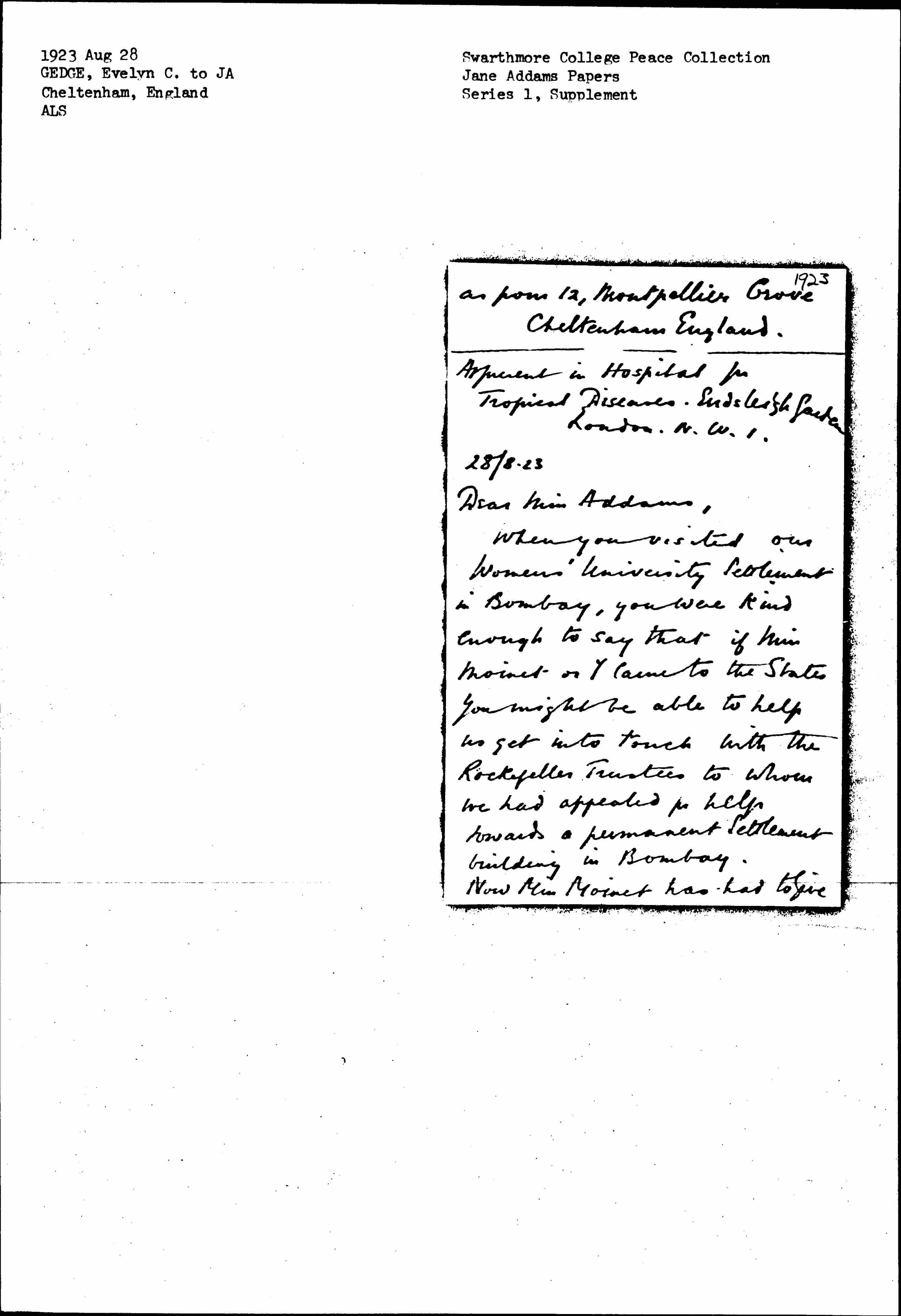 When you visited our Women's University Settlement in Bombay, you were kind enough to say that if Miss Moinet or I came to the States you might be able to help us get into touch with the Rockefeller Trustees to whom we had appealed for help toward a permanent Settlement building in Bombay.